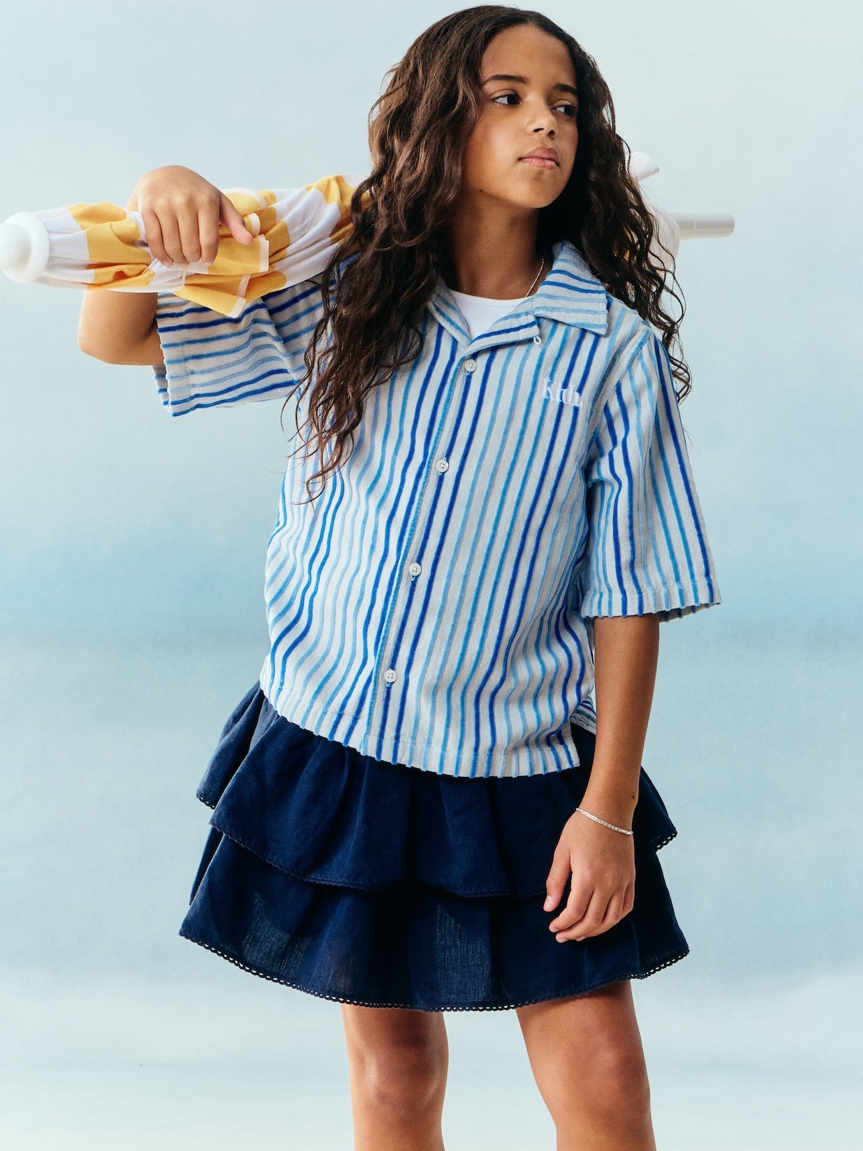 やわらかなストライプのシェニールコットンや、軽やかなリネン混、表情のあるドビー素材を使用し、襟付きシャツや定番のキャンプシャツ、ショーツやスカートのセットアップとして展開。すべてのアイテムに、さりげない刺繍ロゴと実用的なポケット、着やすさを考えたディテールを備えています。