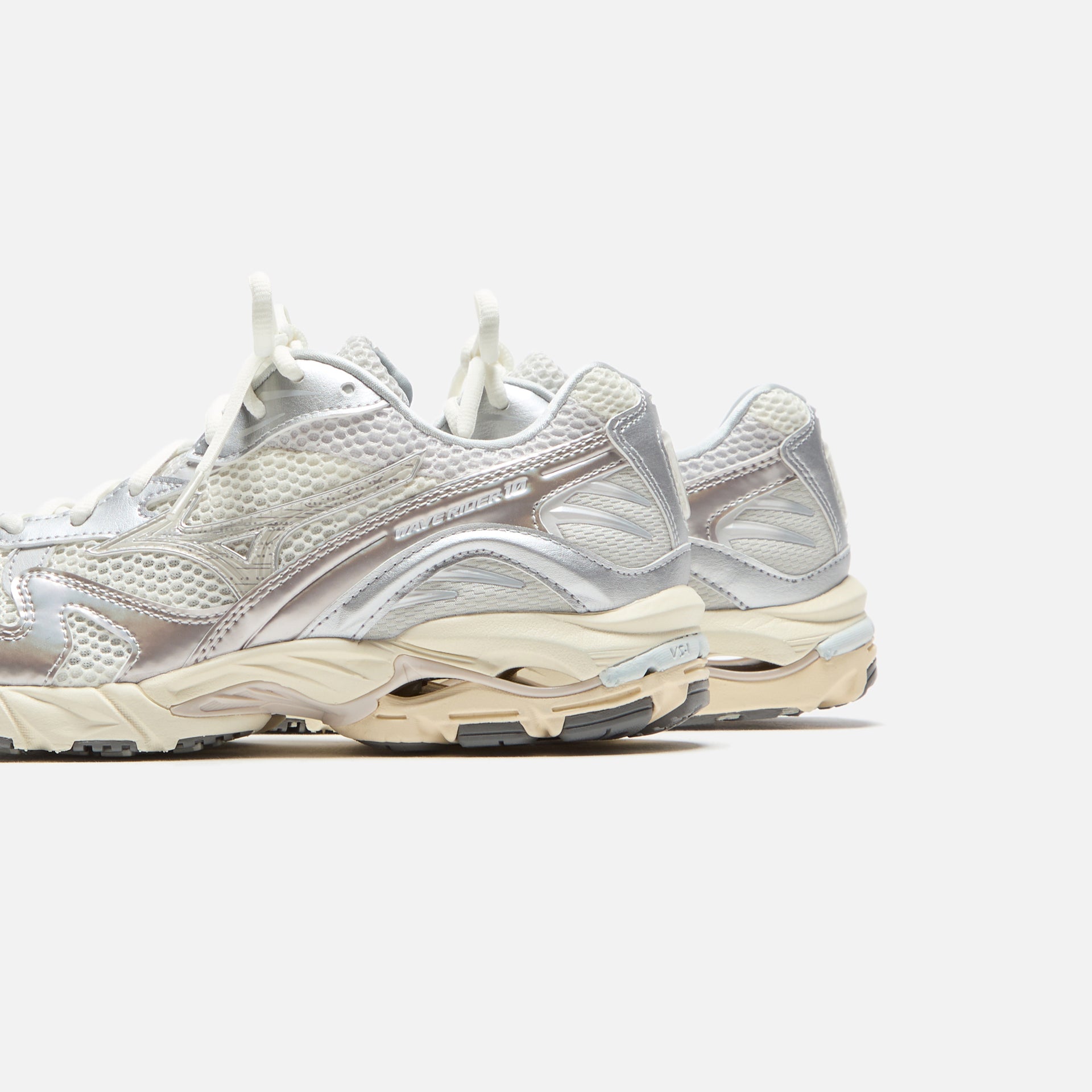 A heritage runner reimagined for modern style, the Mizuno Wave Rider 10 returns in a sleek monochrome palette with silver and white overlays. Featuring the iconic Wave Plate technology for responsive cushioning, this silhouette merges technical performance with street-ready aesthetics. Subtle branding and premium materials highlight Mizuno’s legacy of design innovation, while the layered upper delivers both breathability and bold dimension.