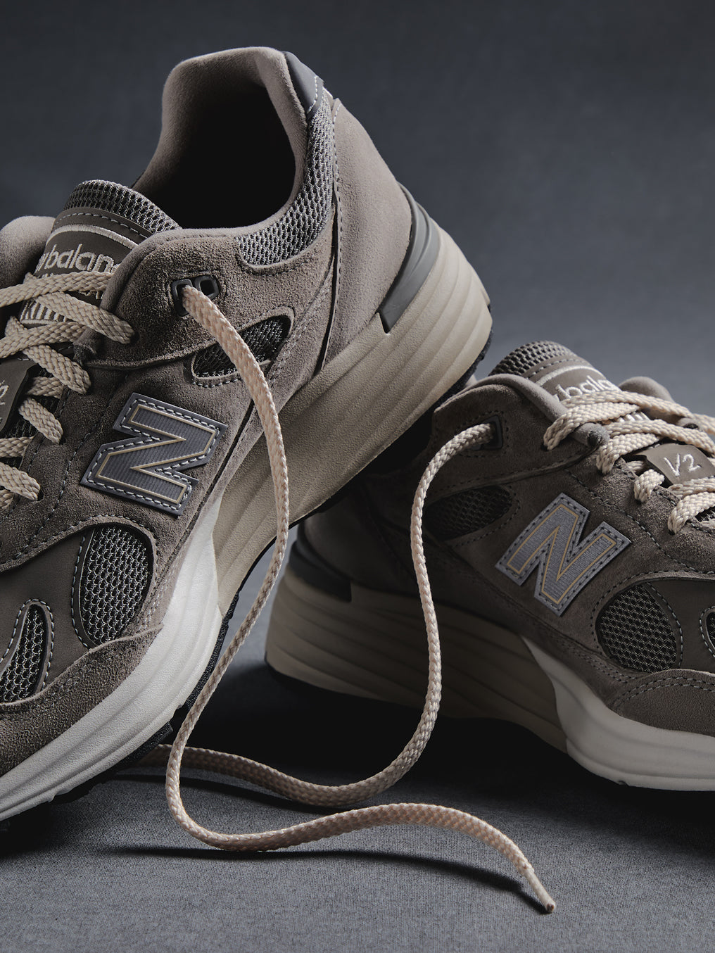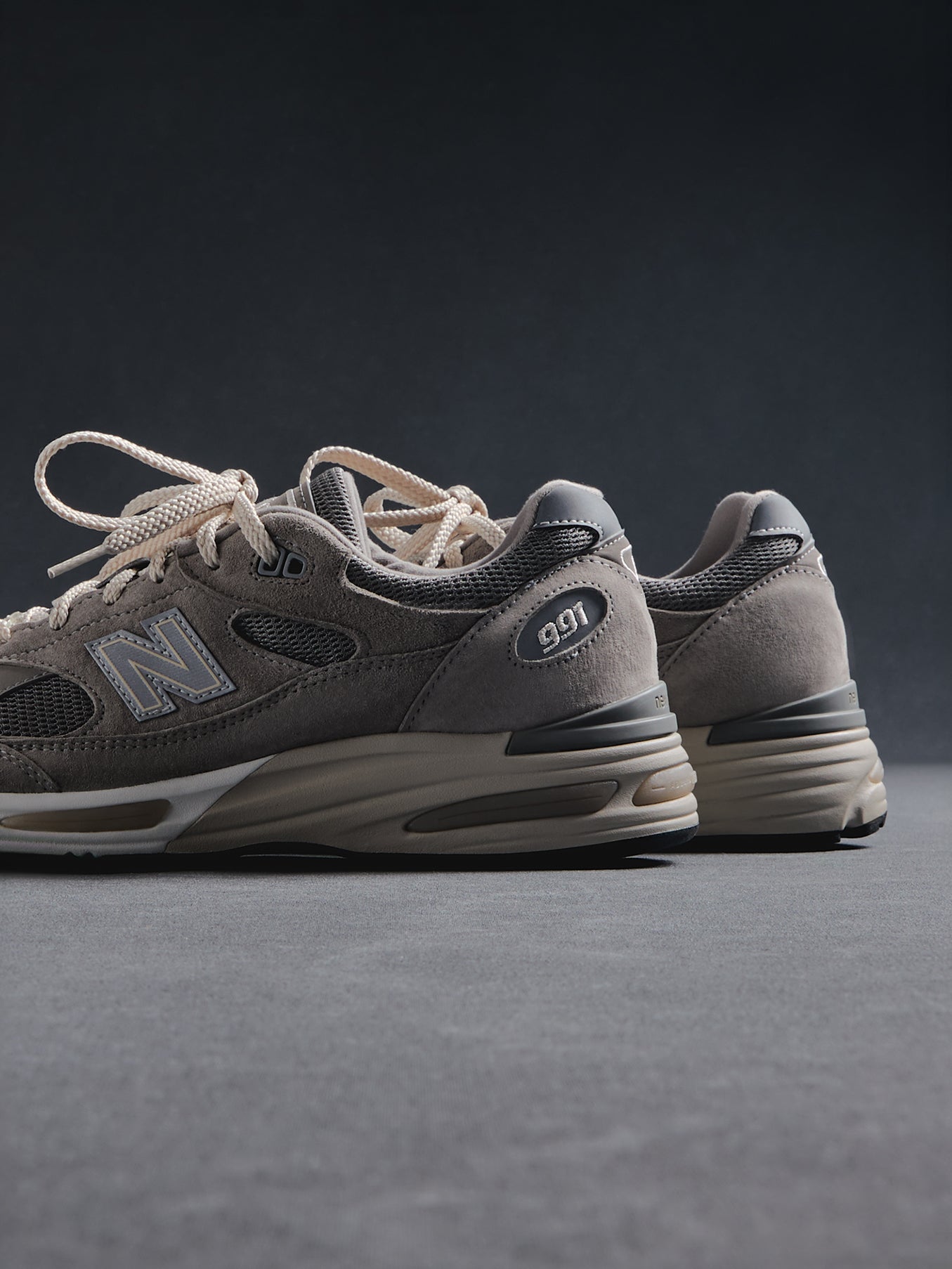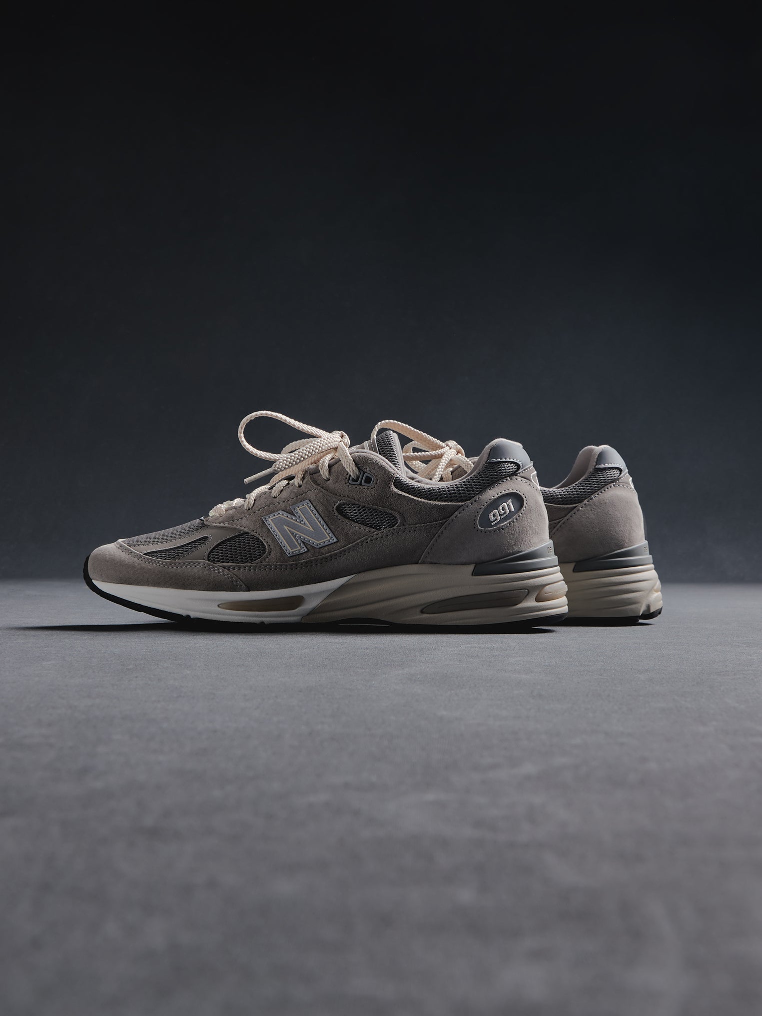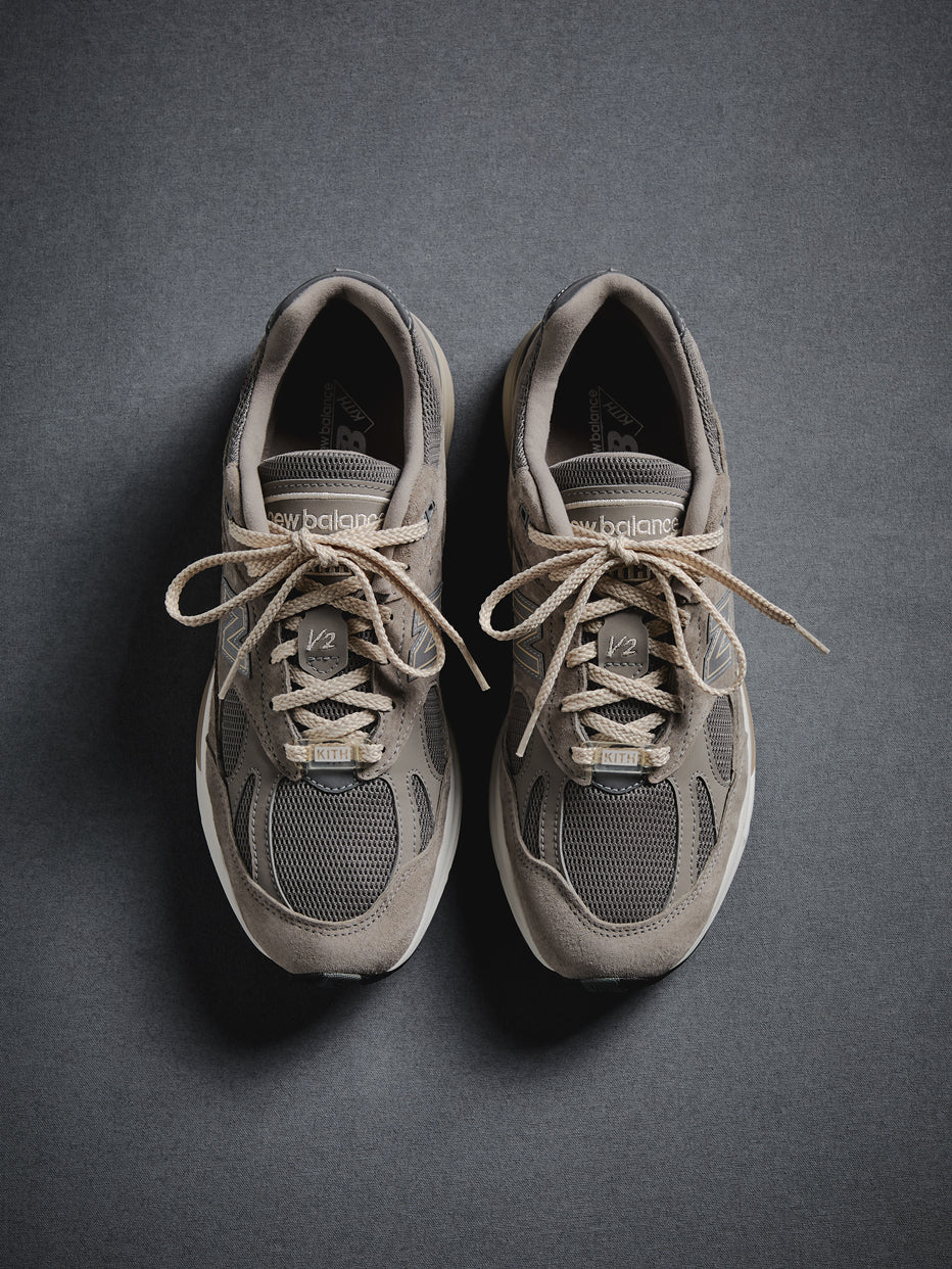 New Balanceの「Made in UK」プログラムは、細部までこだわったクラフトマンシップ、上質な素材使い、そして時代を超えるデザインで高く評価されています。今回のKith 101 & New Balanceコレクションの両モデルには、耐久性の高いピッグスキンスエードを使用し、メッシュアンダーレイ、リフレクティブアクセント、フラットウーブンレースを採用。さらに、追加の替え紐も付属します。991v1はメンズ・ウィメンズ両サイズで展開し、ヒール、タン、フットベッドにKithのブランディングを配し、カスタムのKithダブレ(シューレース下部のプレート)も備えています。一方の991v2には、アンクルの外側、タン、フットベッドにKithブランディングが施されています。また、両モデルはソールユニットにも違いがあり、991v1はミッドソールにABZORBポッドを搭載。991v2はABZORBポッドに加え、FuelCellクッショニングを採用しており、高いエネルギーリターンと優れた快適性を実現しています。