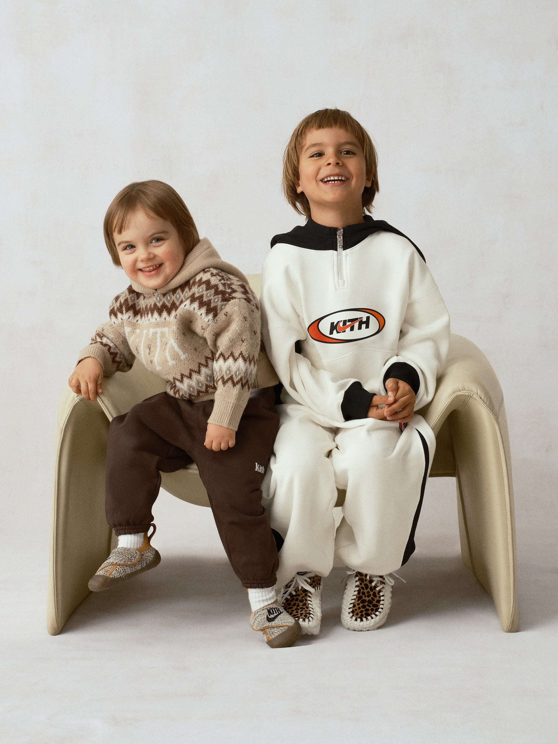 スニーカーコレクションの最後を締めくくるのは、Swoosh One で Crib(ベビー)サイズで登場します。カラーは、Black、Coconut、Maroon の3色展開です。Nike を象徴する Flyknit を採用し、着脱しやすいベルクロストラップ、"Just Us"のヒールプルタブ、そしてアッパーには Kith と Nike Swoosh の刺繍ロゴを配しています。すべてのモデルは、Kith Monogram を全面にあしらった専用ボックス入りで、ホリデーシーズンのギフトにも最適な仕様となっています。