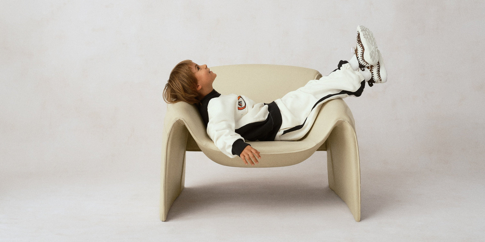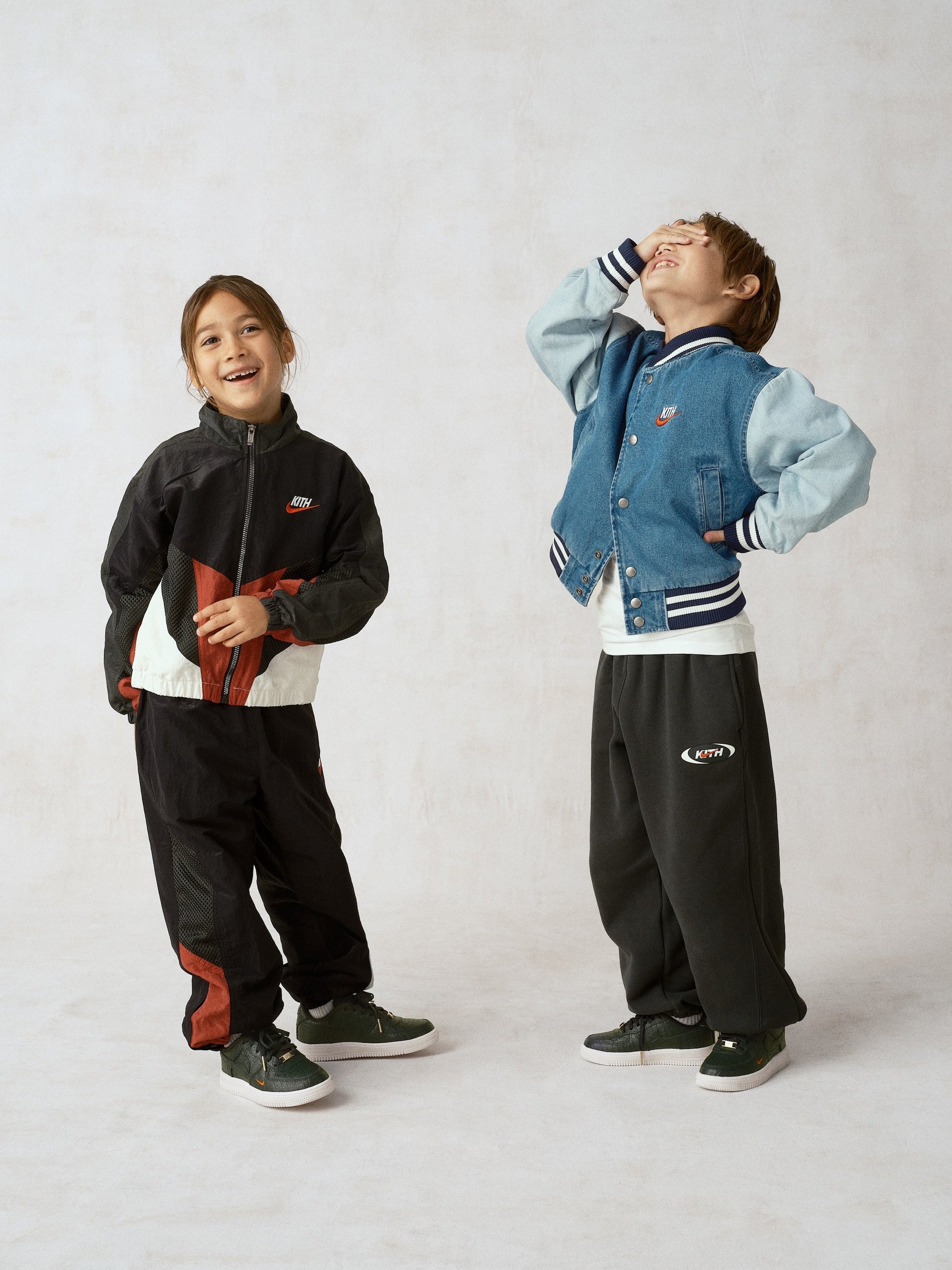 Kith Kids for Nike のアパレルコレクションは、Nike のアーカイブから着想を得たヴィンテージスポーツのシルエットで構成されています。Dri-FIT、Tech Fleece、通気性のあるコットンなど、Nike のパフォーマンス素材を採用しているのも特徴です。注目アイテムには、レーザープリントで全体にコラボレーションロゴを施したデニムのバーシティジャケット、スウッシュ型のジップディテールがポイントとなるフリースドレス、Kith Swoosh アートワークをレイヤードしたメッシュオーバーレイ仕様のトラックジャケットなどが揃います。また、Footscape で採用されたアニマル柄モチーフを落とし込んだデザインも本アパレル全体に登場し、さらに光沢感のあるモノグラムパッケージに収められたベビーボディスーツ3枚セットも展開します。