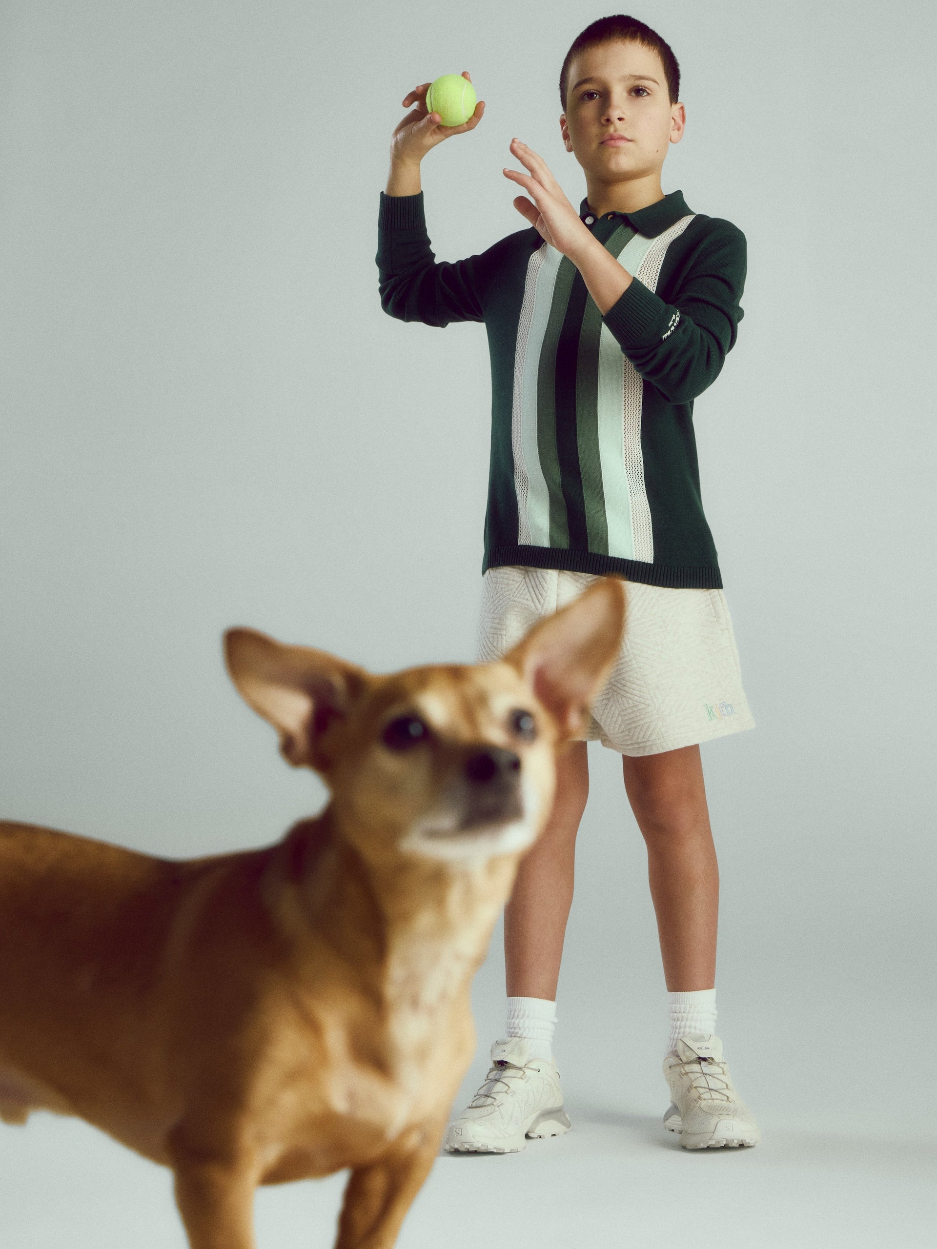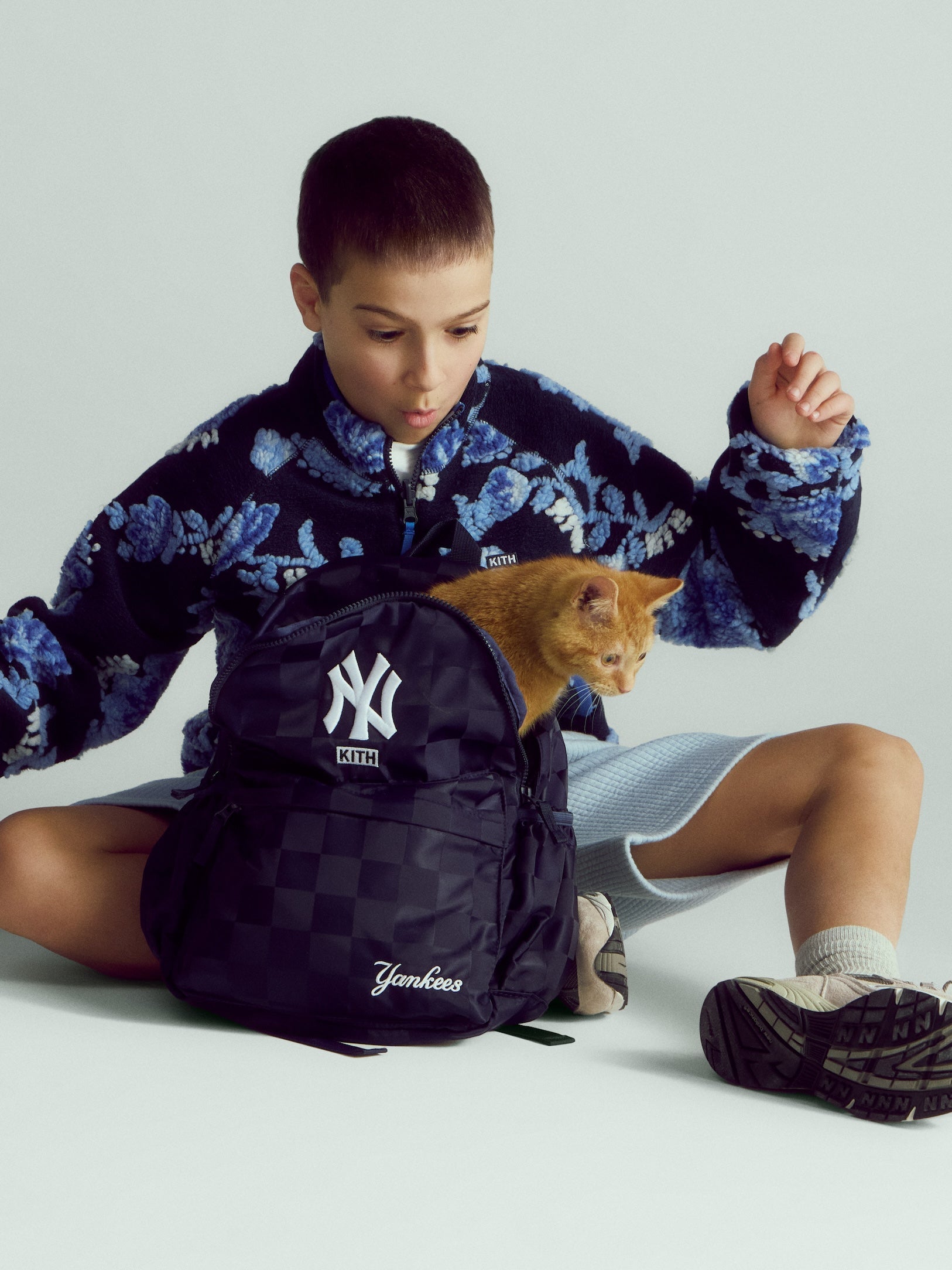 本コレクションでは、軽やかなレイヤリングに最適なアウターも充実。過去のKithコレクションで展開されたNY to the World Varsity Jacketをキッズサイズにアレンジしたモデルや、ヴィンテージから着想を得たシェニール刺繍を施したNY to the World Cardigan、Cropped Apollo Shirt、Novelty Leon Jerseyなど、今季を象徴するアイテムが揃います。