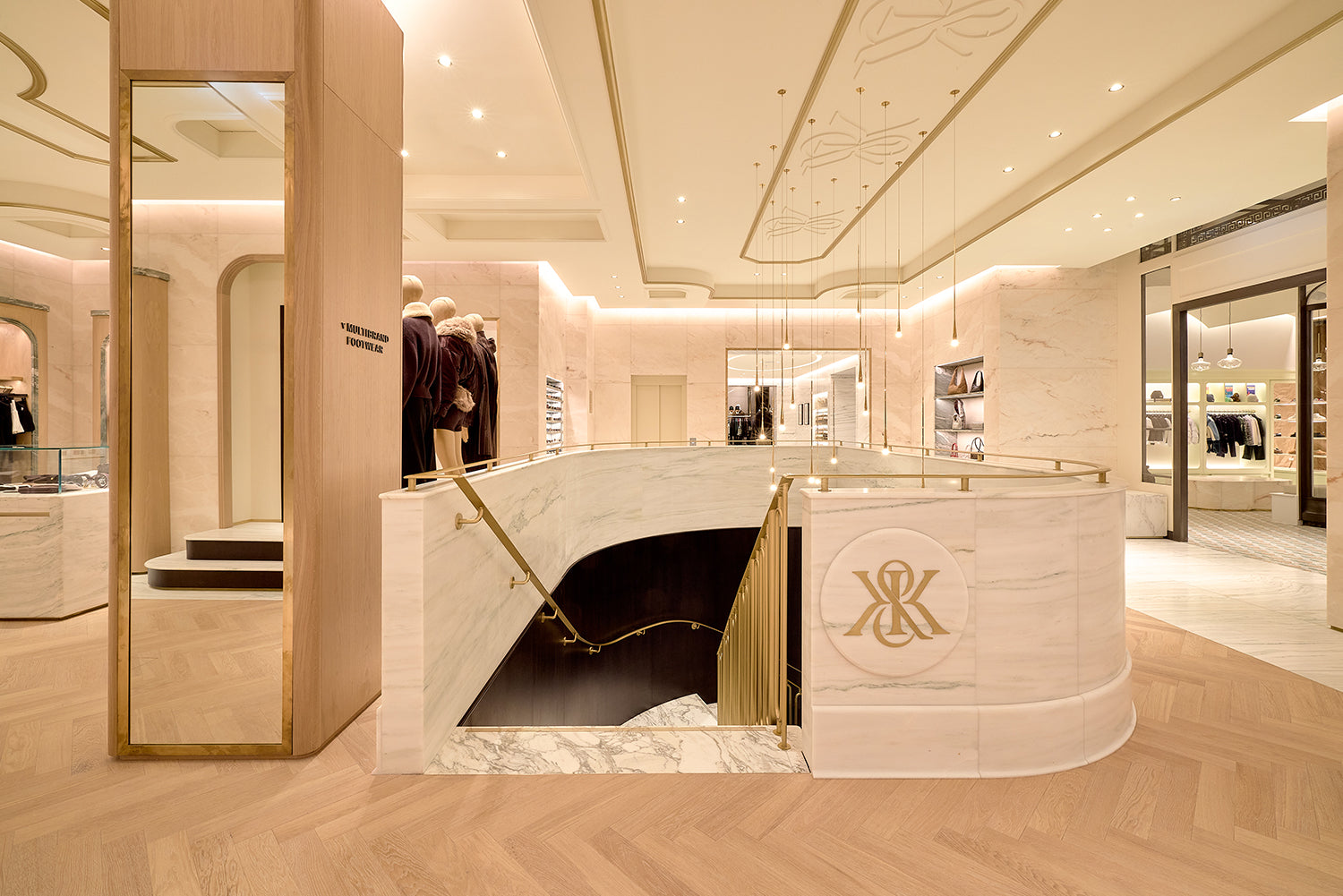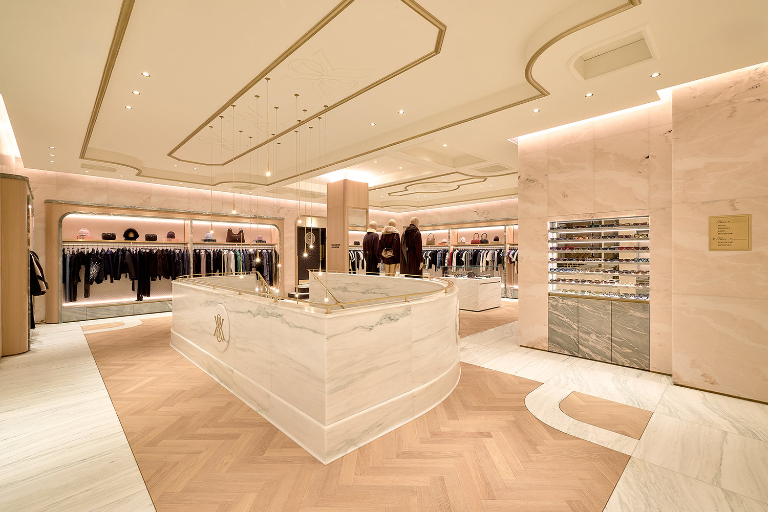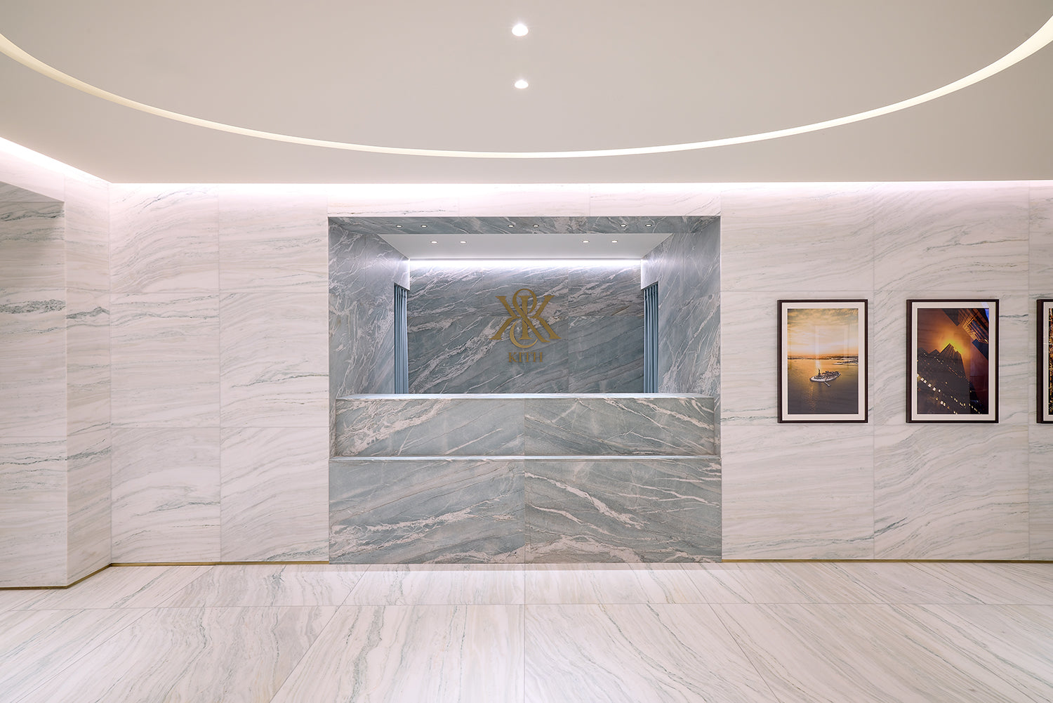 エントランスを抜け、左右に並ぶ Kith Kids と Kith Treats の空間を通り過ぎると、来店者を迎えるのは、より明るい雰囲気で構成された Kith Women の空間です。ここでは、カスタム仕上げのホワイトオークによるミルワークをベースに、Crystal Tiffany マーブルの装飾、Estremoz マーブルを用いた壁面、そして Pentelikon マーブルによるバンドやインレイを組み合わせ、オークのヘリンボーンフロアとともに、洗練された空間を構成しています。その佇まいは、シカゴやニューヨークにオープンした最新の Kith Women ストアを想起させるデザインとなっています。このエリアでは、Kith Women のアパレルやアクセサリーをフルラインナップで展開し、最新のシーズンコレクションやコラボレーションアイテムもご覧いただけます。