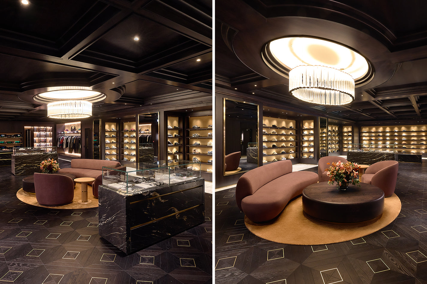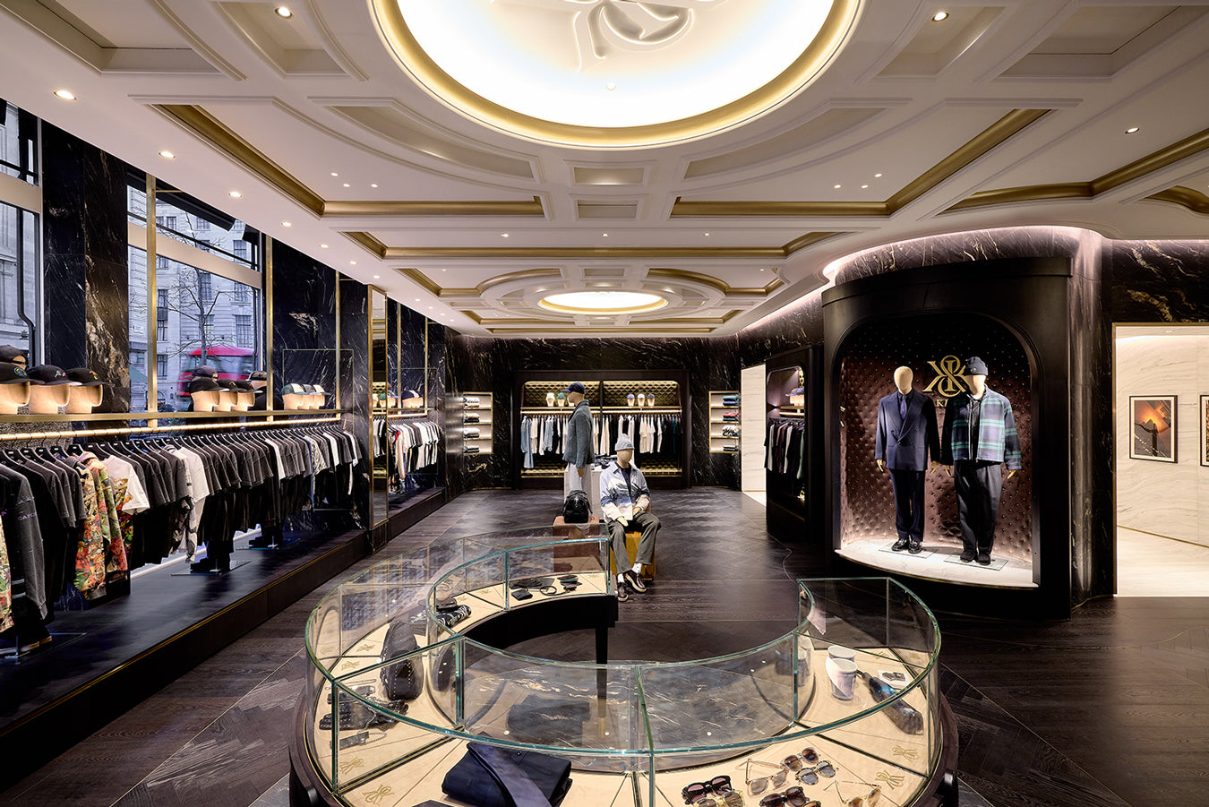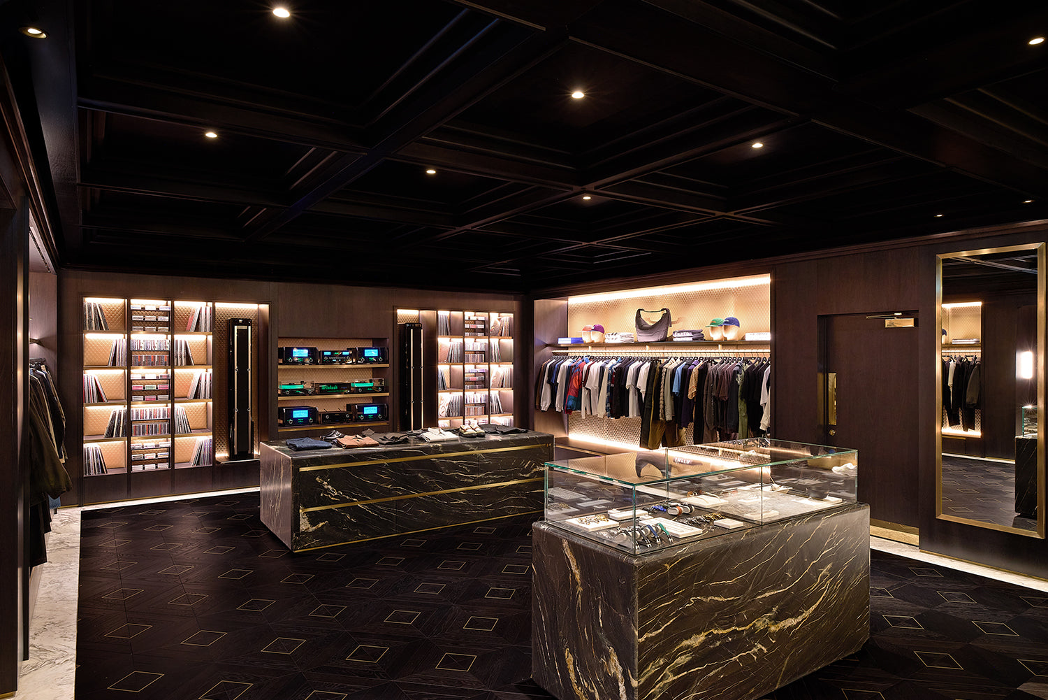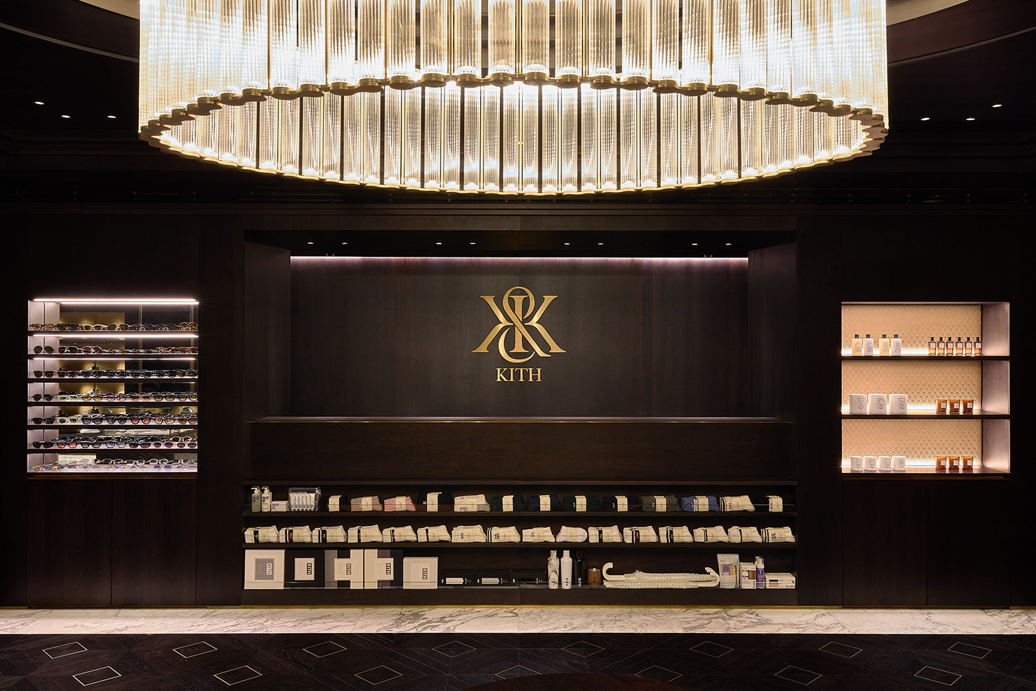 Kith Women エリアの右側、チェックアウトエリアを抜けた先には、より深みのある濃色のパレットで構成された空間が広がります。ウォルナット材による特注造作や Belvedere マーブルを用いた壁面、Calacatta Vagli マーブルのテーブル、そして空間全体に施された Kith エンボスレザーが特徴的なデザインです。深みのあるウッドヘリンボーンのフロアや、ダイヤモンドタフティングのグリーンベルベットによるアクセント、さらにプラスターモールディングを施した天井に組み込まれたリセス照明が相まって、広い空間でありながらも、温かく親密な雰囲気を演出しています。このエリアでは、Kith のシーズナルコレクションをはじめ、アクセサリーやファインジュエリー、各種コラボレーションアイテムをご覧いただけます。また、Kith London 限定のアパレルやアクセサリーも展開します。