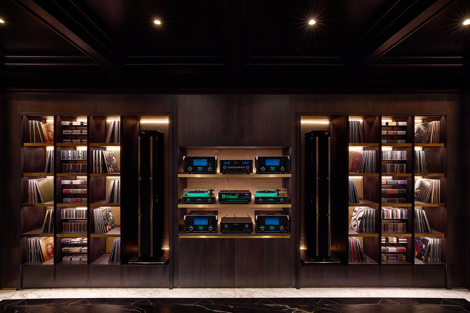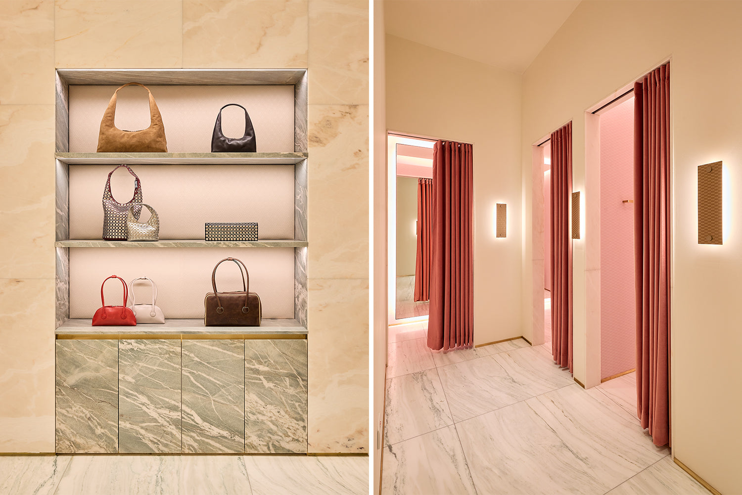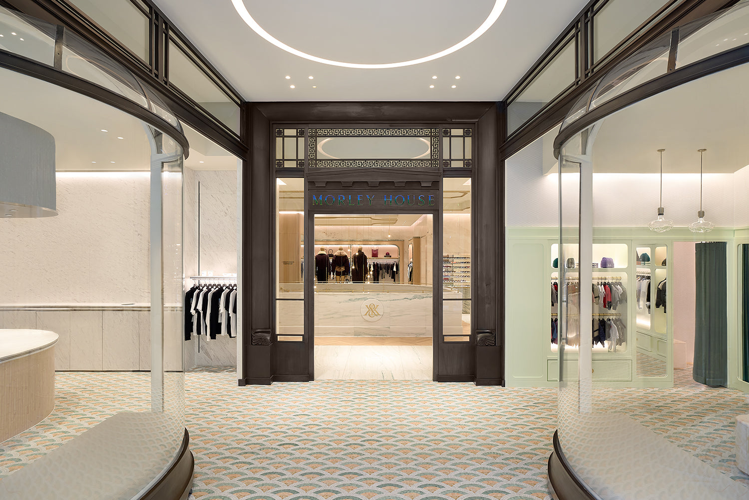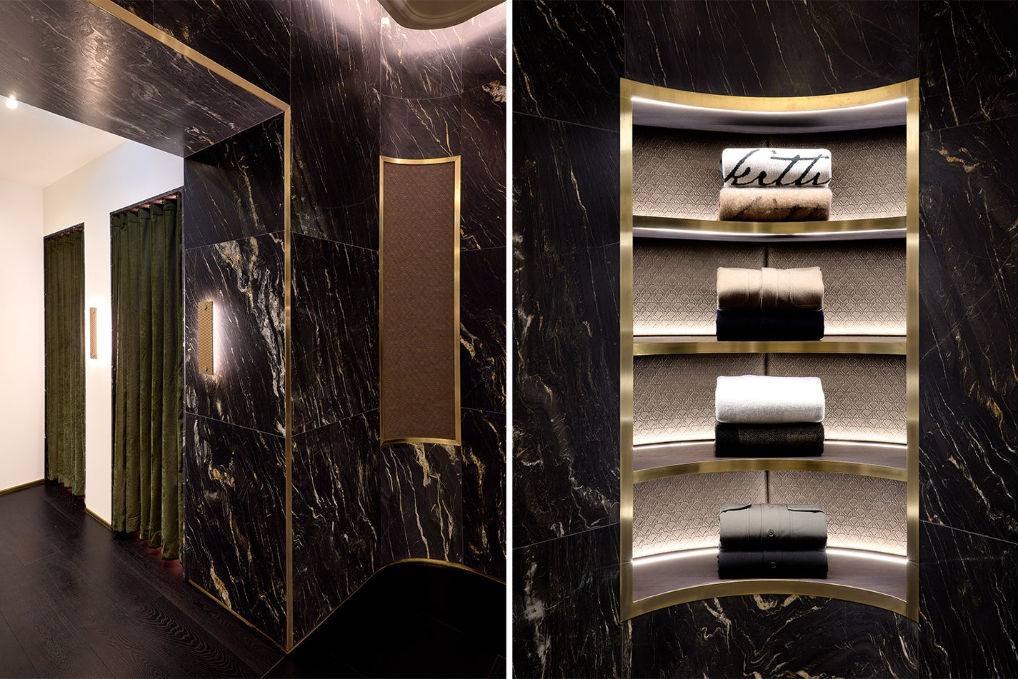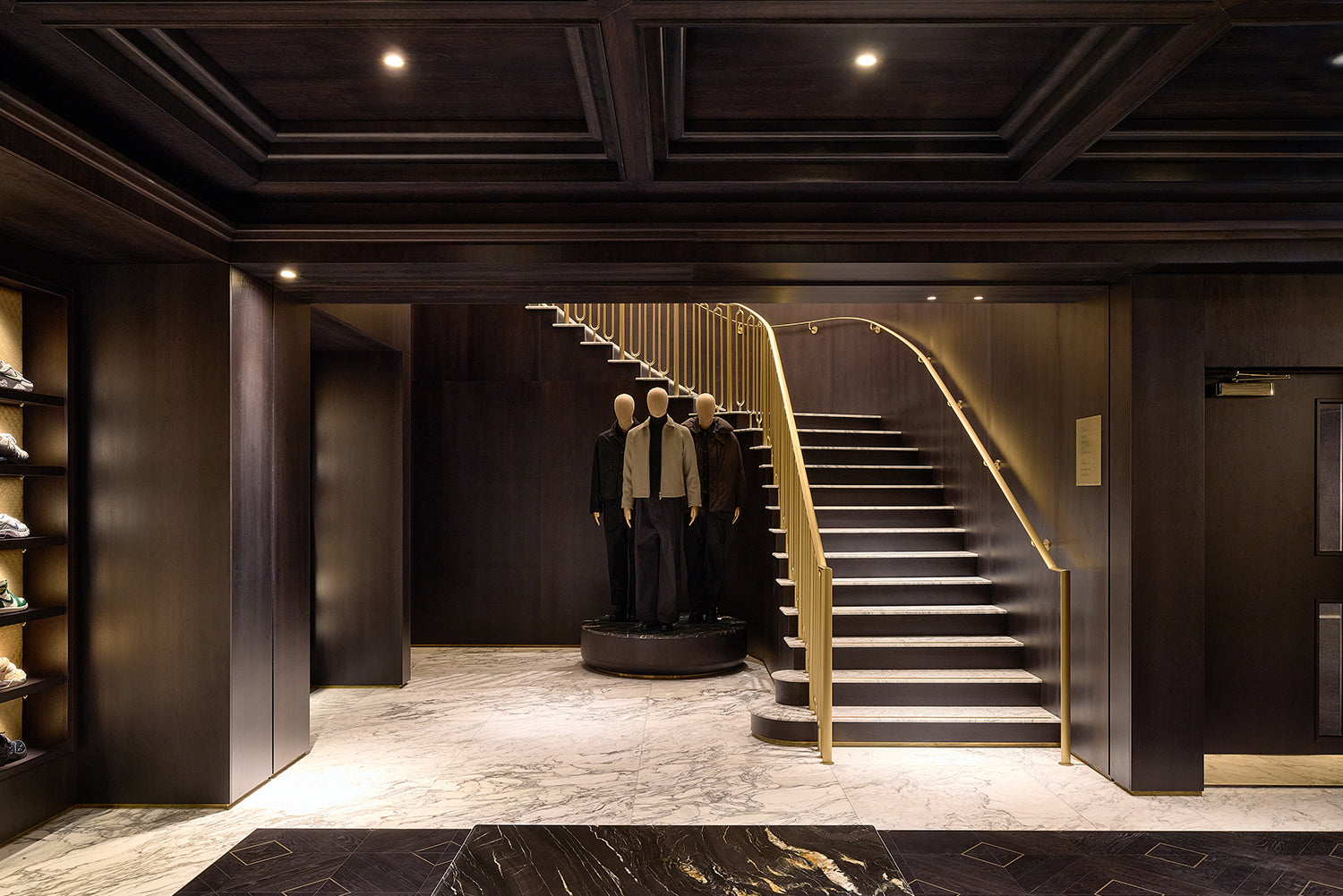 Kith Women エリアの右側、チェックアウトエリアを抜けた先には、より深みのある濃色のパレットで構成された空間が広がります。ウォルナット材による特注造作や Belvedere マーブルを用いた壁面、Calacatta Vagli マーブルのテーブル、そして空間全体に施された Kith エンボスレザーが特徴的なデザインです。深みのあるウッドヘリンボーンのフロアや、ダイヤモンドタフティングのグリーンベルベットによるアクセント、さらにプラスターモールディングを施した天井に組み込まれたリセス照明が相まって、広い空間でありながらも、温かく親密な雰囲気を演出しています。このエリアでは、Kith のシーズナルコレクションをはじめ、アクセサリーやファインジュエリー、各種コラボレーションアイテムをご覧いただけます。また、Kith London 限定のアパレルやアクセサリーも展開します。