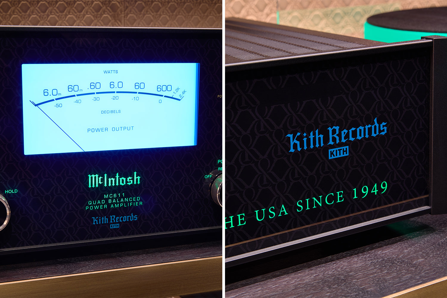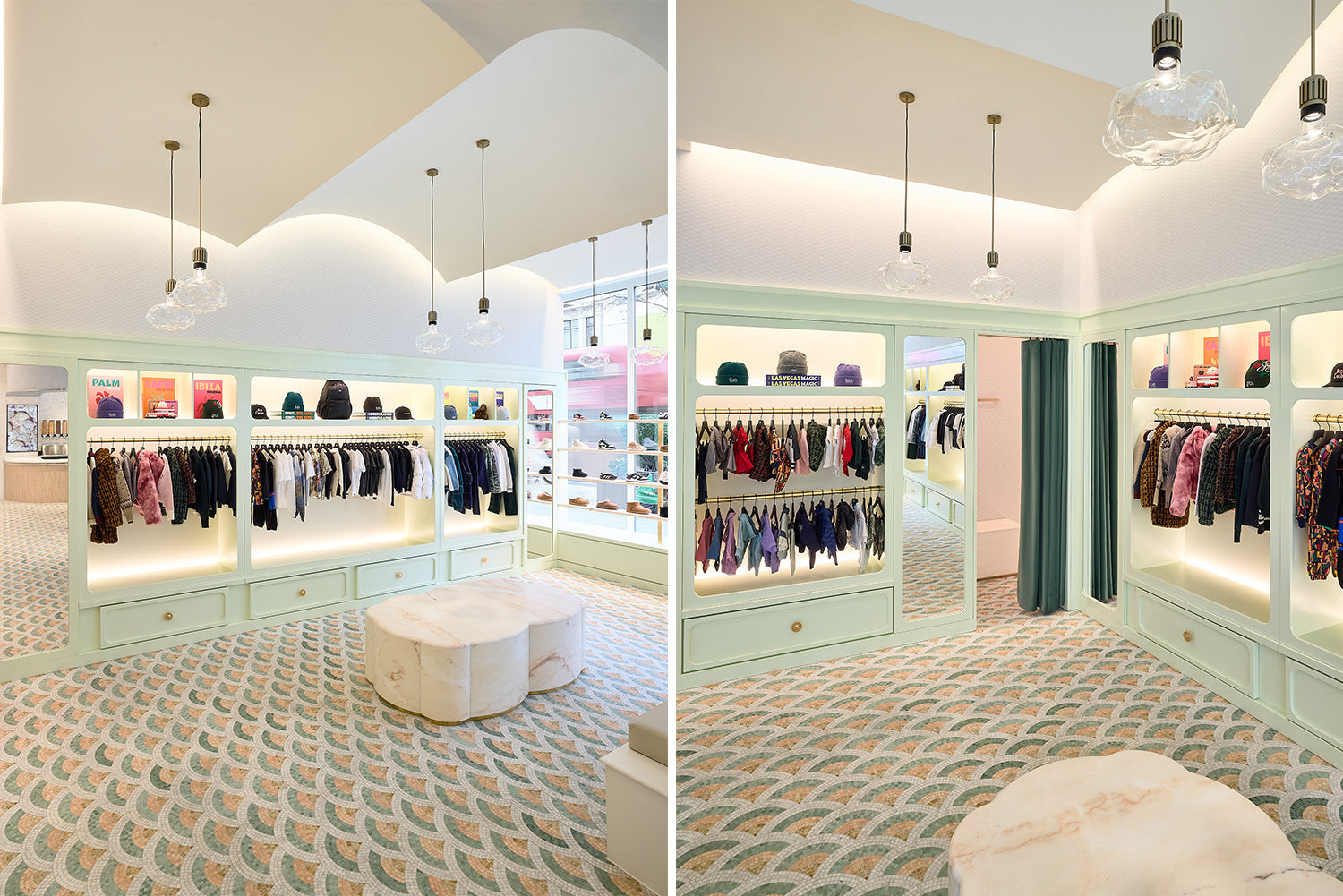 To the right of the Kith Women space and through the checkout area, guests will experience a much darker, richer palette, consisting of walnut millwork, Belvedere marble walls and Calacatta Vagli marble tables , alongside Kith embossed leatherwork throughout. It is complete with deep wood herringbone floors, diamond-tufted green velvet accents, and recessed lighting on the plaster moulded ceilings, evoking a warm, intimate feeling throughout the space that is vast by square footage. This is where Kith seasonal collections can be shopped, accessories alongside fine jewelry, and Kith collaborations. Kith London-exclusive apparel and accessories will also be available at this location.