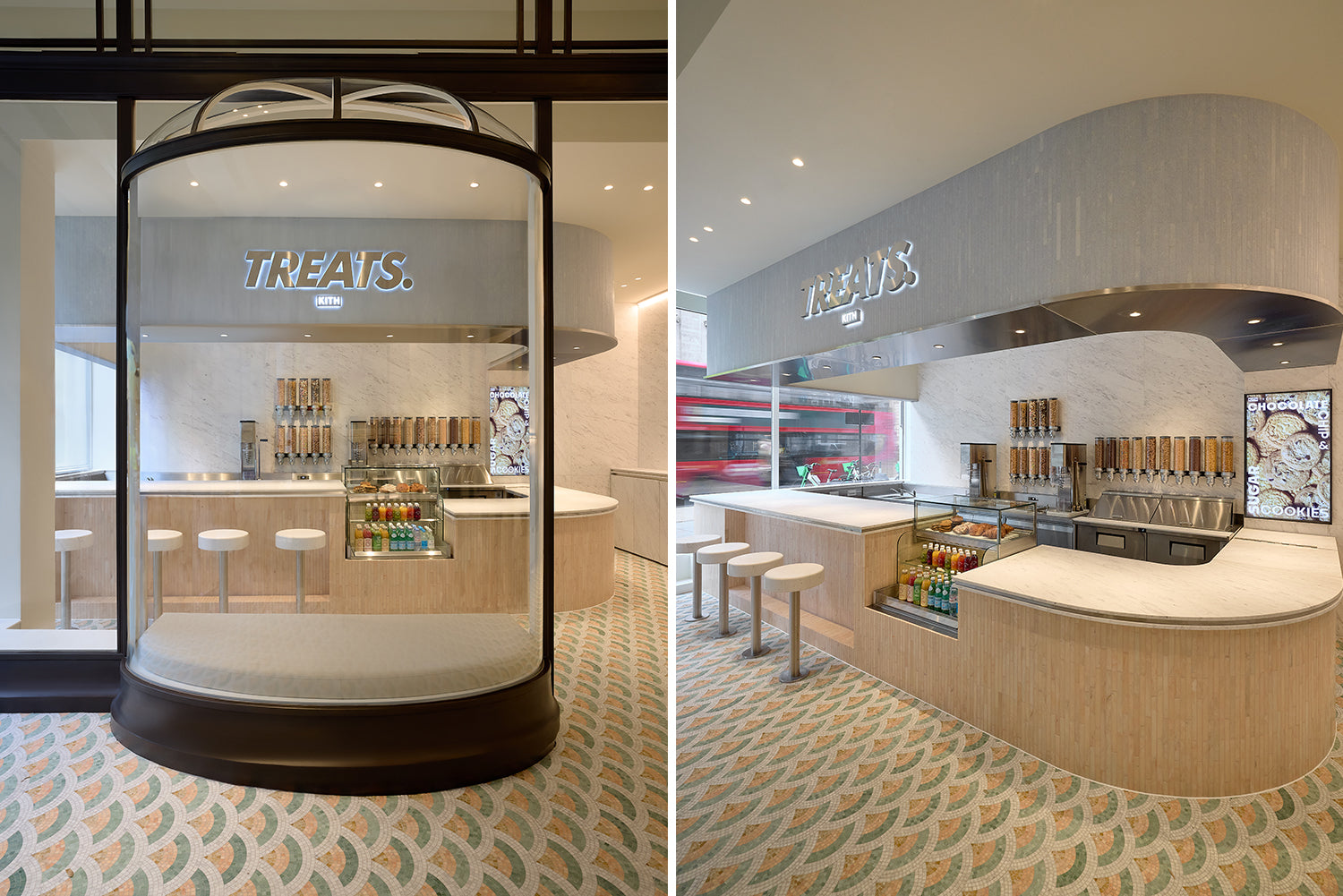 On each side of the entrance is Kith Kids and Kith Treats, Kith Kids featuring a lighter color palette defined by its signature cloud motif turned into the ceiling structure and Kith Monogramming throughout. Defining materials are Estremoz marble, a custom fan mosaic, and satin brass accents, featuring an elevated playful spirit that encompasses the Kith Kids brand. Kith Treats has classic bar-style seating, a muted pastel palette with the same custom fan mosaic found in Kith Kids, Rosa Portugalo, and Azul Cielo marble alongside Volakas marble counters, and stainless steel trim and accent metal. Kith Treats London will feature all mainstay menu items, alongside Signature Specials exclusive to that location.