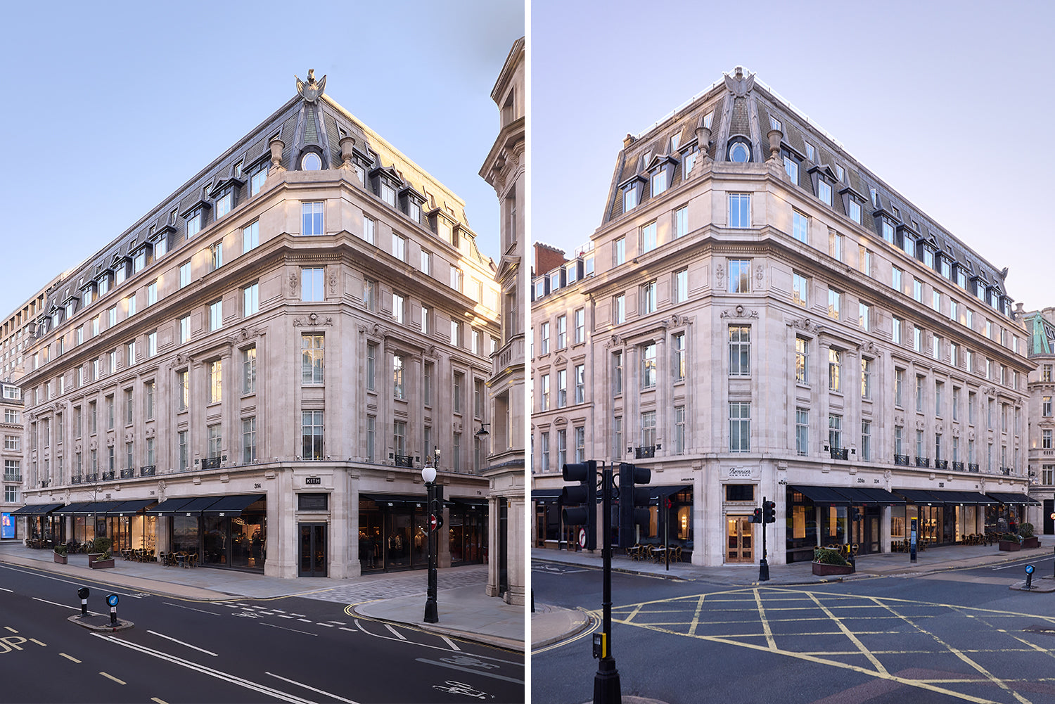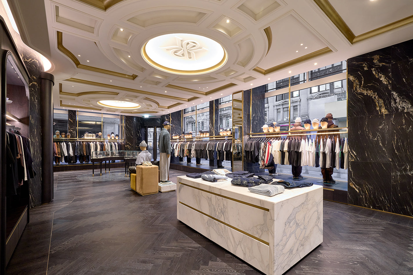 Kithは、かつて318番地と324番地として存在していた Regent Street 沿いのスペースを統合し、Regent Street と Little Portland Street(リトル・ポートランド・ストリート)が交差する角地に、2フロアから成る大規模なホスピタリティ空間を完成させました。店舗には、Kith のリテールスペースへと繋がる2つの専用エントランス、そしてレストラン「Ronnie’s」に通じる入口が設置されています。建物のファサードは、John Nash が設計したオリジナルの Regent Street 建築の一部であり、1920年代の再開発期にネオ・バロック様式へと再建された歴史的背景を持ちます。メインエントランスには、当時から残る玄関ホール(ベスティビュール)が保存されており、曲線を描くガラス面や、100年以上前の窓ガラスがそのまま維持されています。ロンドンでの出店にあたり、この歴史的価値を尊重しながら空間を仕上げることは非常に重要視され、内外装を通じて建築の持つクラシックで格調高い雰囲気が継承されています。Ronnie Fiegは、この旗艦店のためのビジョンを具現化すべく、Porto Architecture の建築家 Ben Porto と協働し、デザインを完成させました。