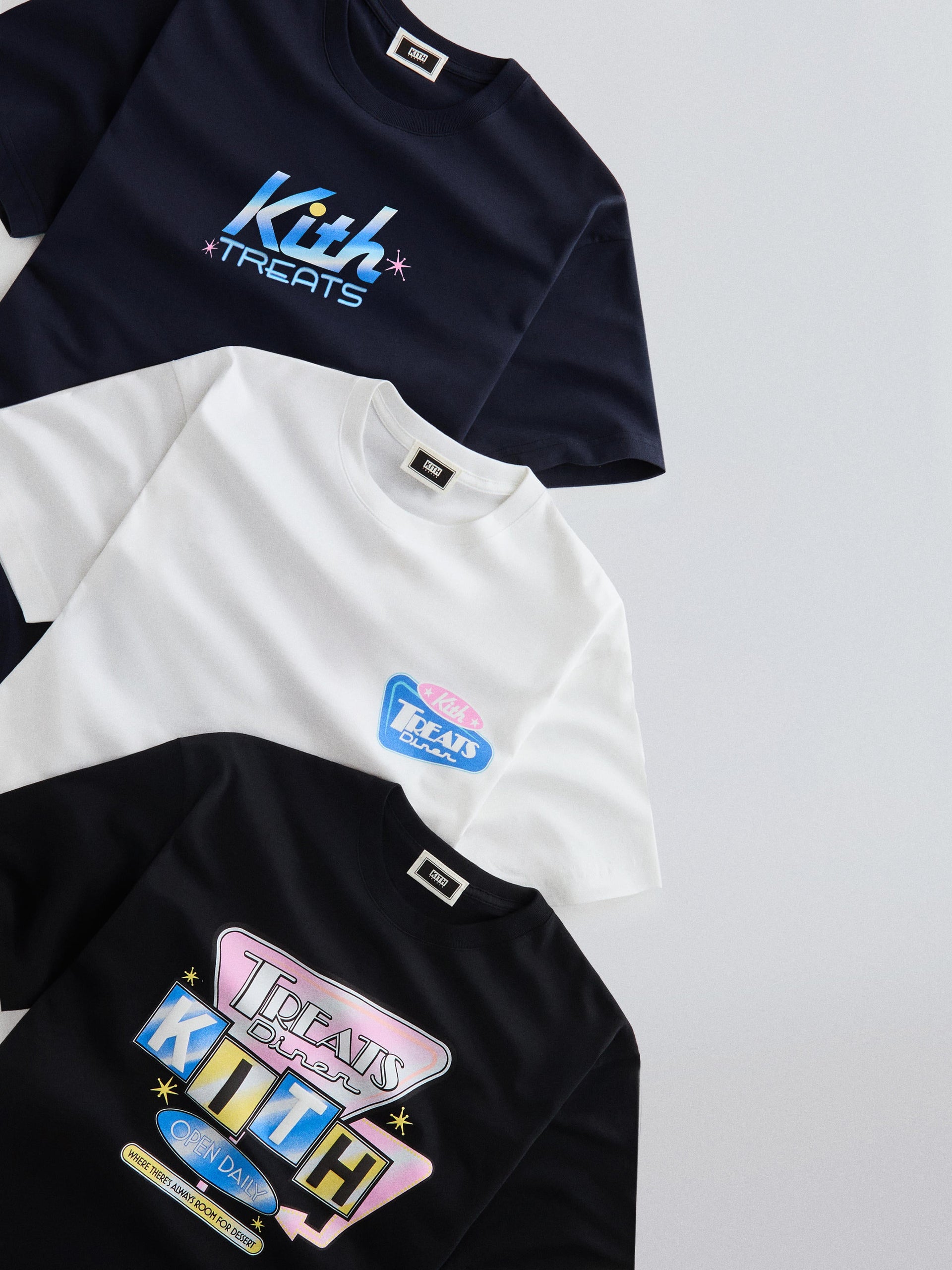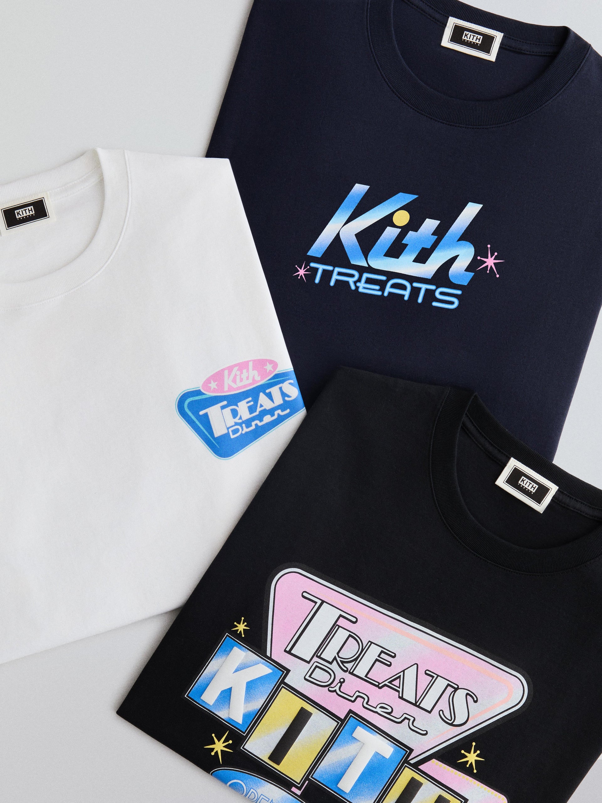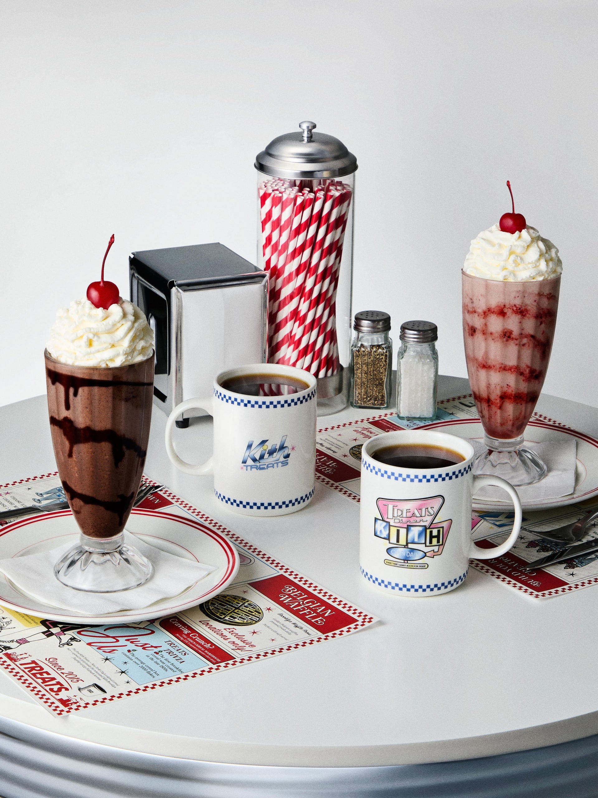 The Treats Diner capsule collection and limited time malted milkshakes will release Saturday, April 25th at all Kith Treats shops worldwide, online, and on the Kith App at 11AM in New York, London, Paris, Tokyo and Seoul timezones.