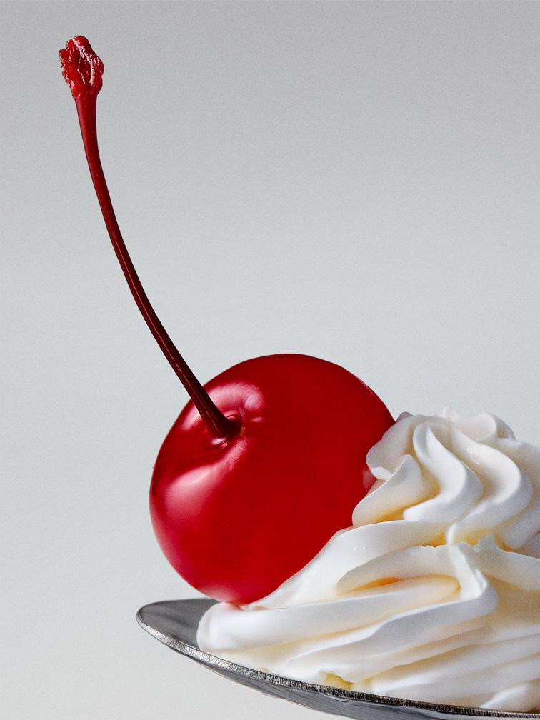 チョコレートアイスクリームに、ココアフレーク、モルトパウダー、ミルクをブレンド。ホイップクリームとチェリーをトッピングし、カップの内側にチョコレートソースをライン状に広げて仕上げています。