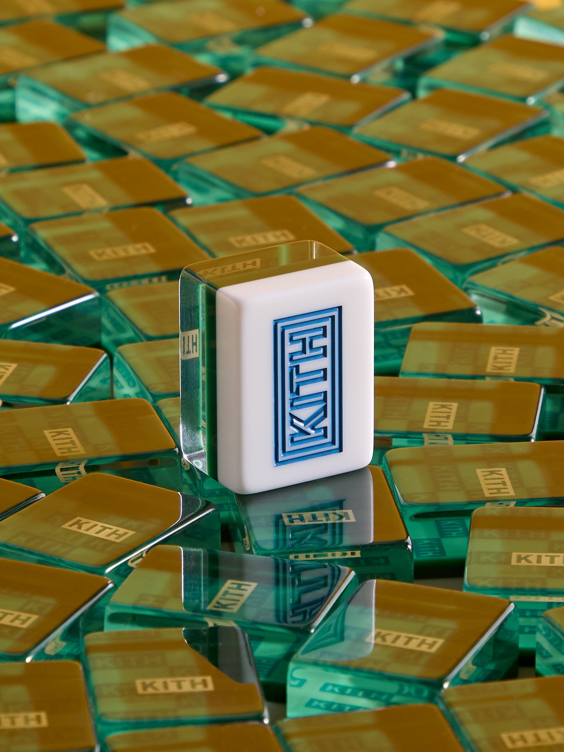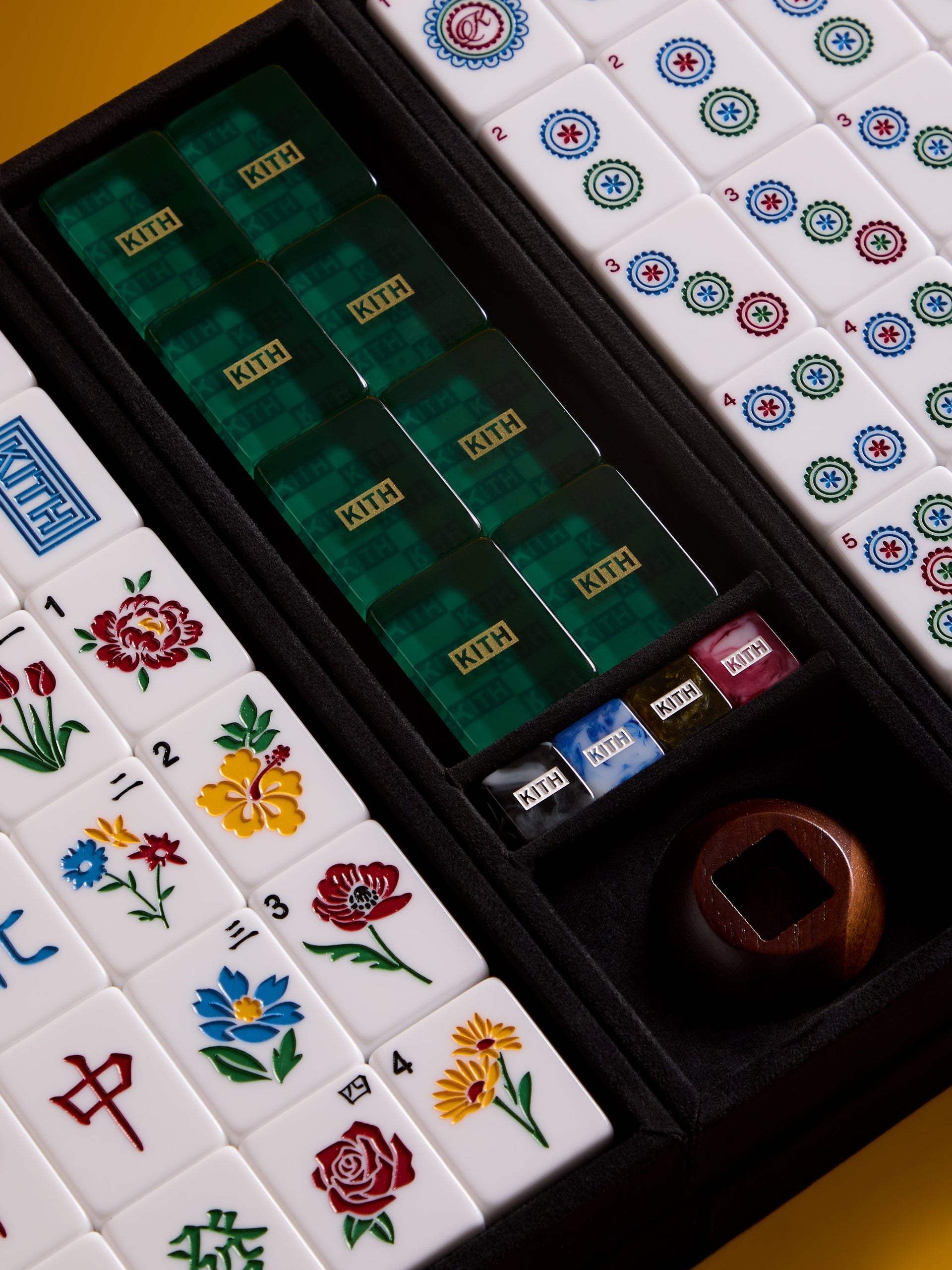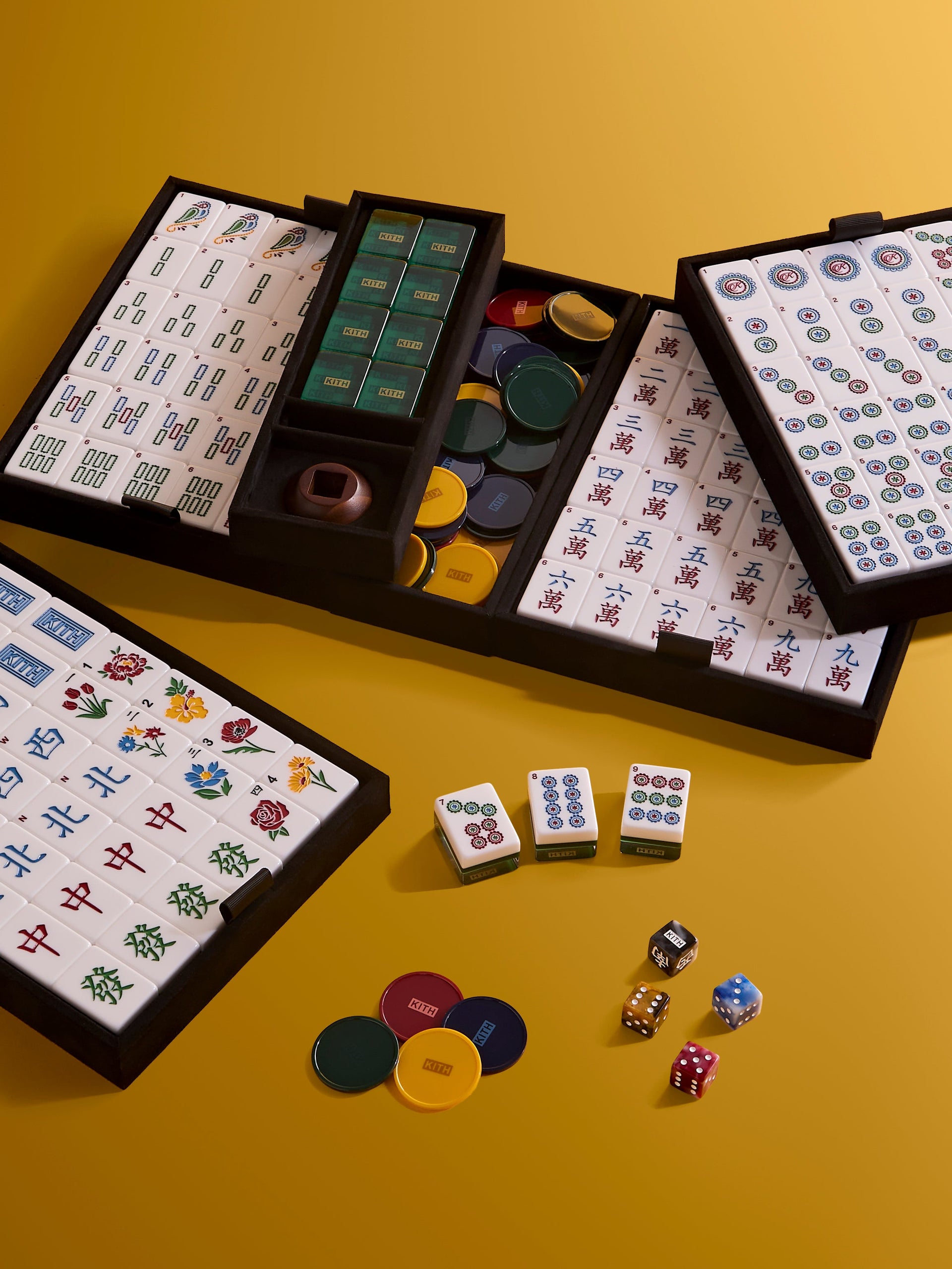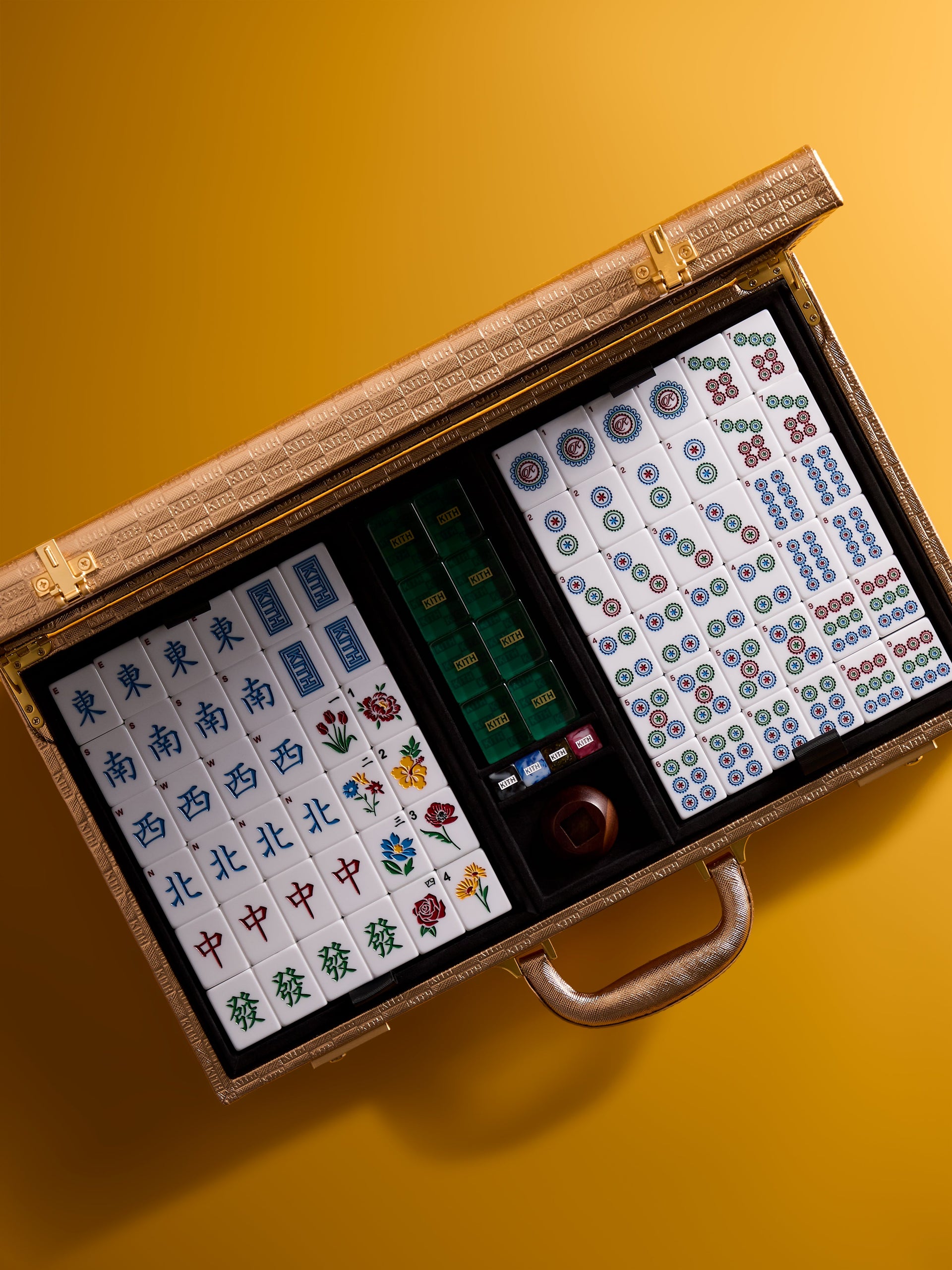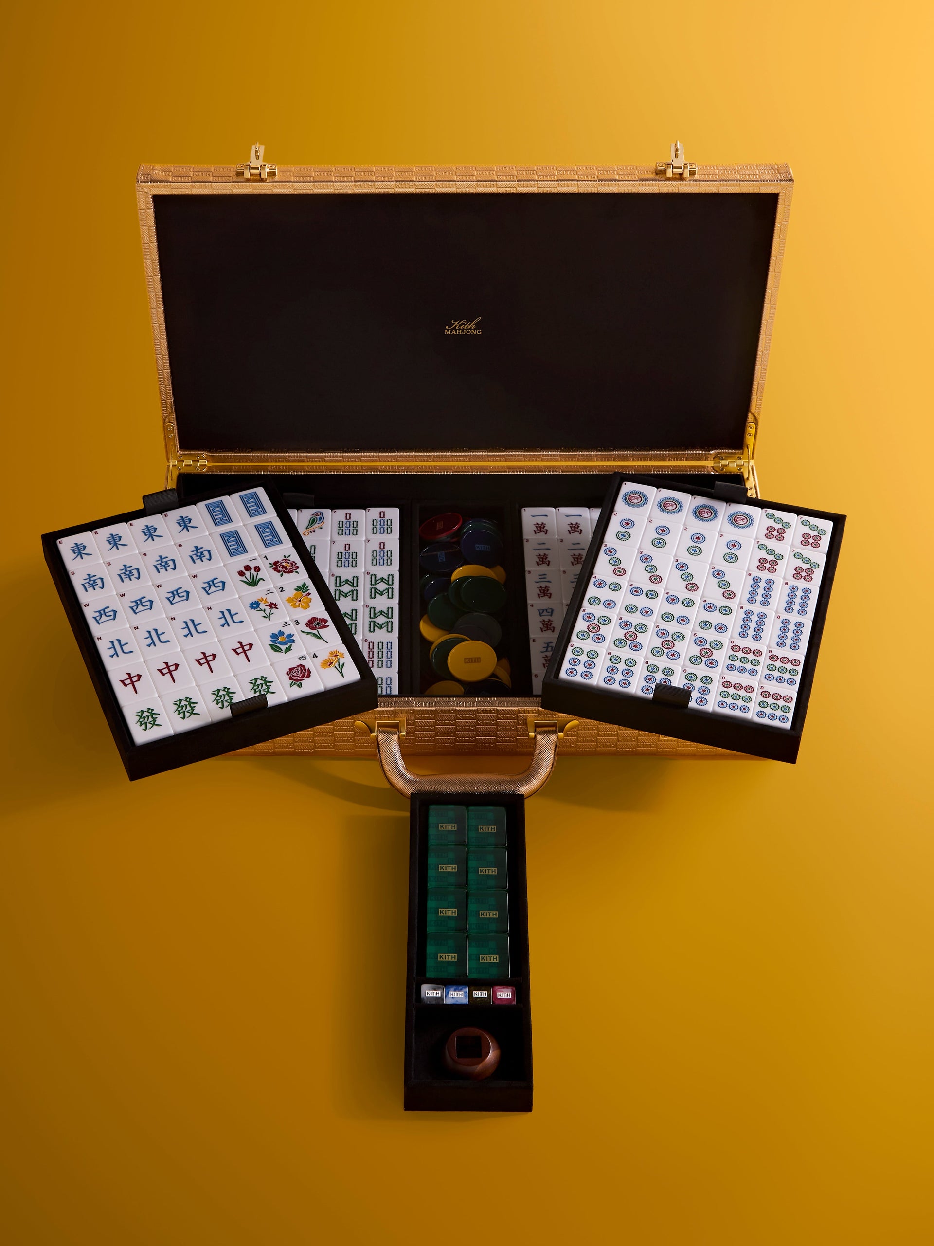 The centerpiece of this festive capsule is the reprisal of a limited-edition Kith Mahjong set, which includes custom designed Kith Mahjong tiles, mixed horn precision wind dice, a wooden wind dice holder and multi-color playing chips housed within in a premium gold Kith Monogram Saffiano leather case.