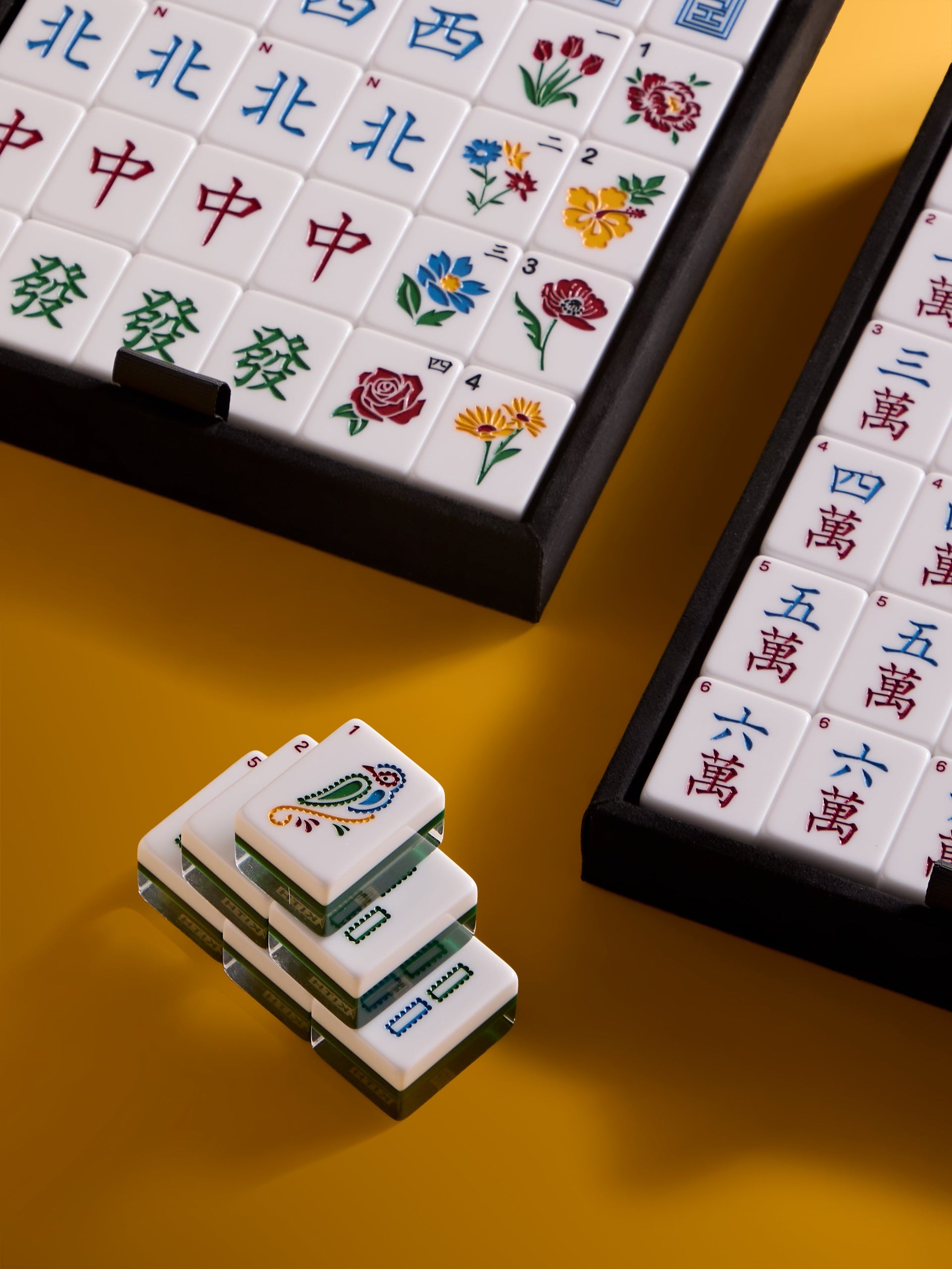本コレクションの中心となるのは、リミテッドエディションとして再登場する Kith Mahjong セットです。カスタムデザインのKithオリジナル麻雀牌をはじめ、ミックスホーン素材のウィンドダイス、木製のウィンドダイスホルダー、マルチカラーのチップを備え、プレミアムゴールド仕様の Kith Monogram Saffiano ケースに収納されています。