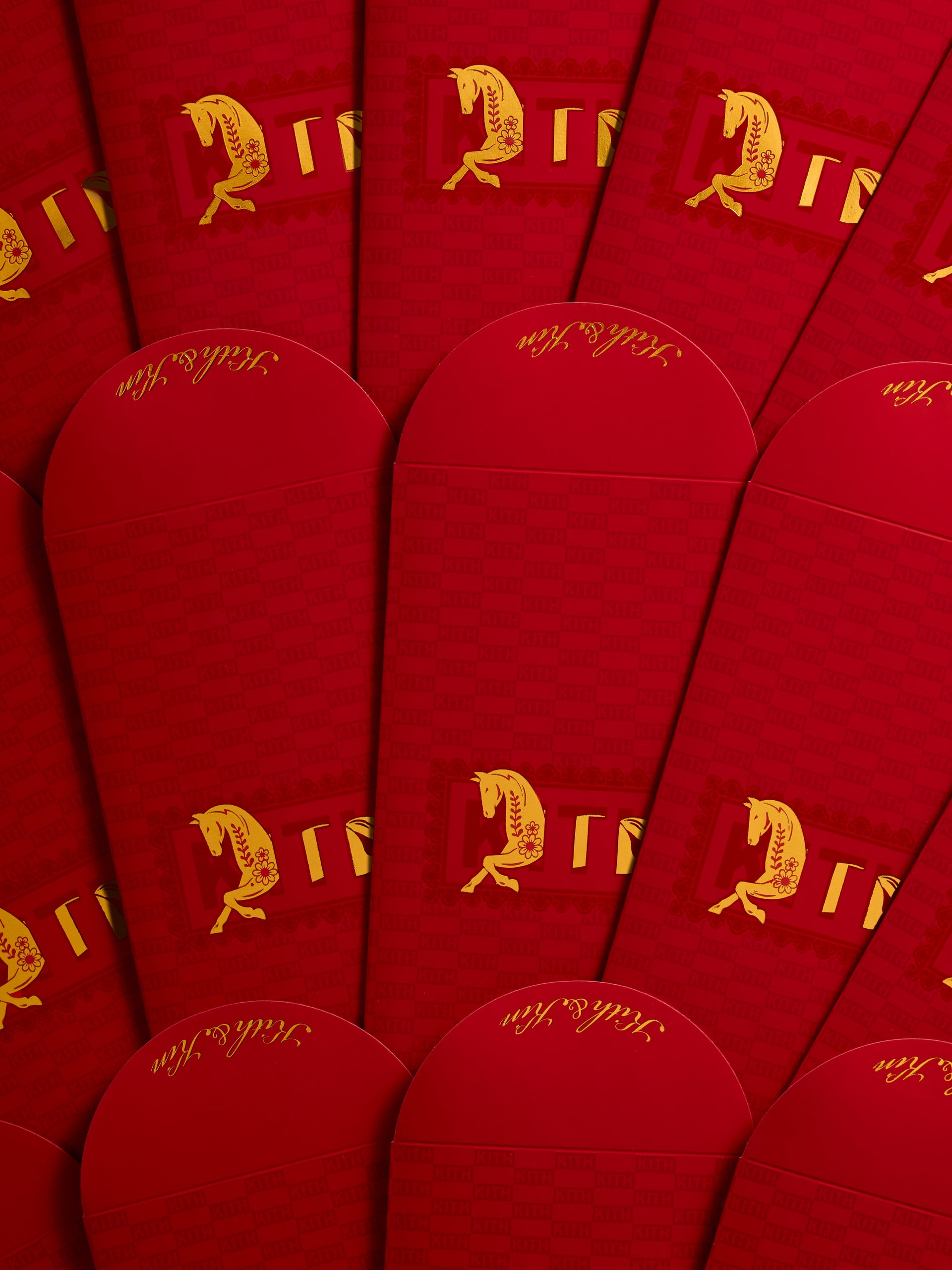 グラフィックアパレルは全5型で、伝統的な中国のアイコノグラフィーから着想を得たオリジナルアートワークを採用。KithのNelson Hoodie、Crewneck、そしてシグネチャーのTシャツには、今季の「Year of the Horse」仕様のKith Classic Logoと、ホリデーシーズンを想起させるイラストレーショングラフィックがあしらわれています。また、ゴールドカラーのペイズリー柄トランプセットや、2色展開のPegasus Leather Key Holderといったアクセサリーもラインナップ。さらに、毎年のリリースで恒例となっている、ゴールド箔押しを施した折りたたみ式のKithオリジナル紅包が5枚セットで登場します。これは、新年の幸運を願い、家族や友人にお金を包んで贈るという旧正月の伝統に敬意を表しています。