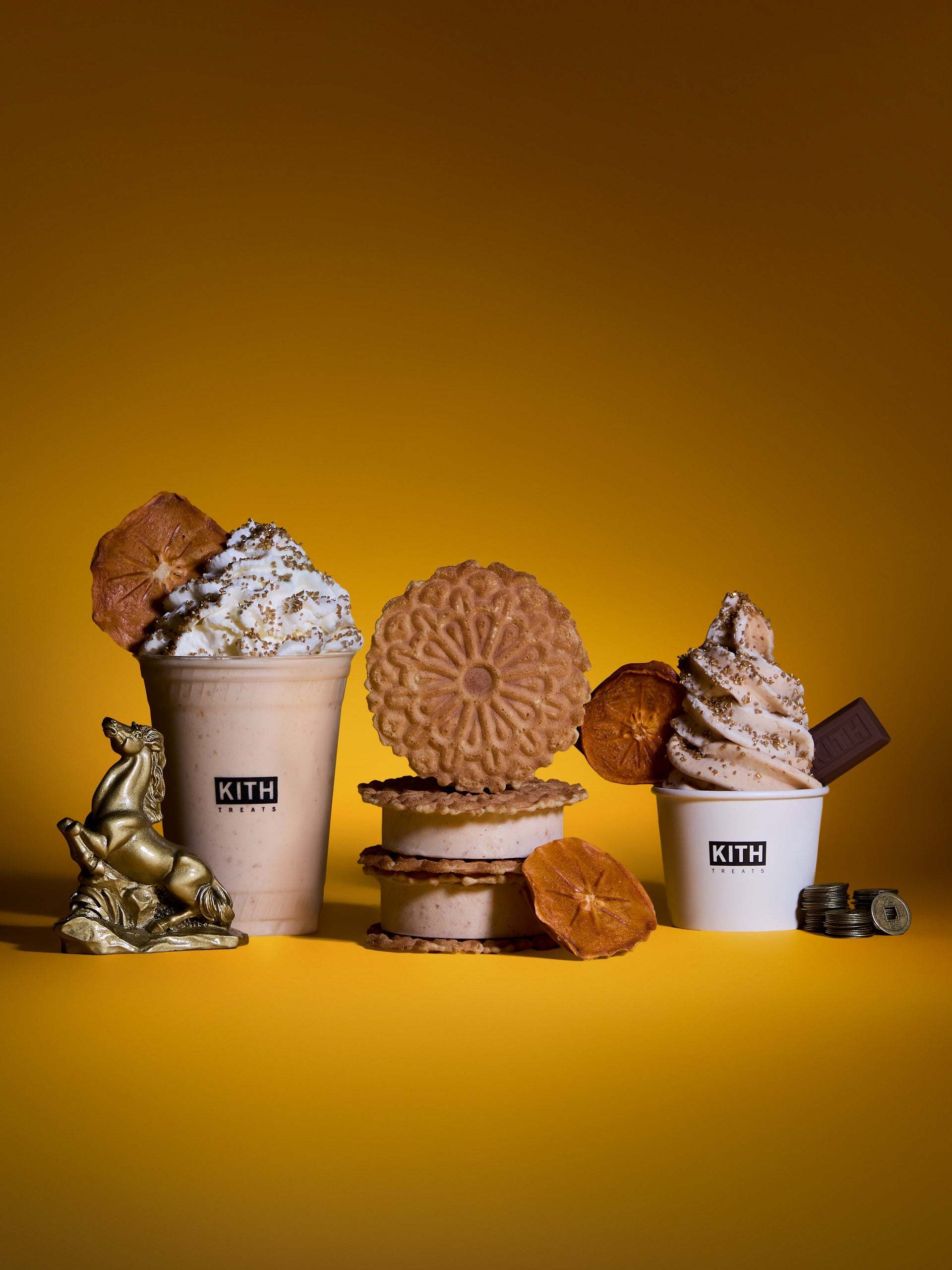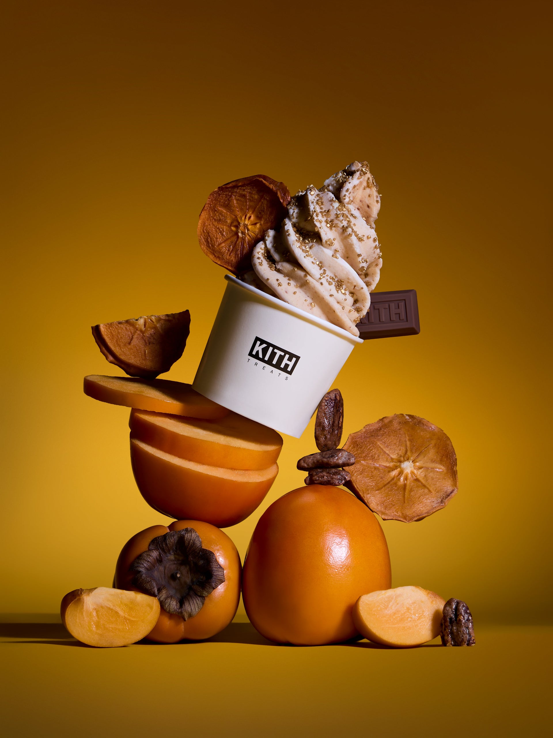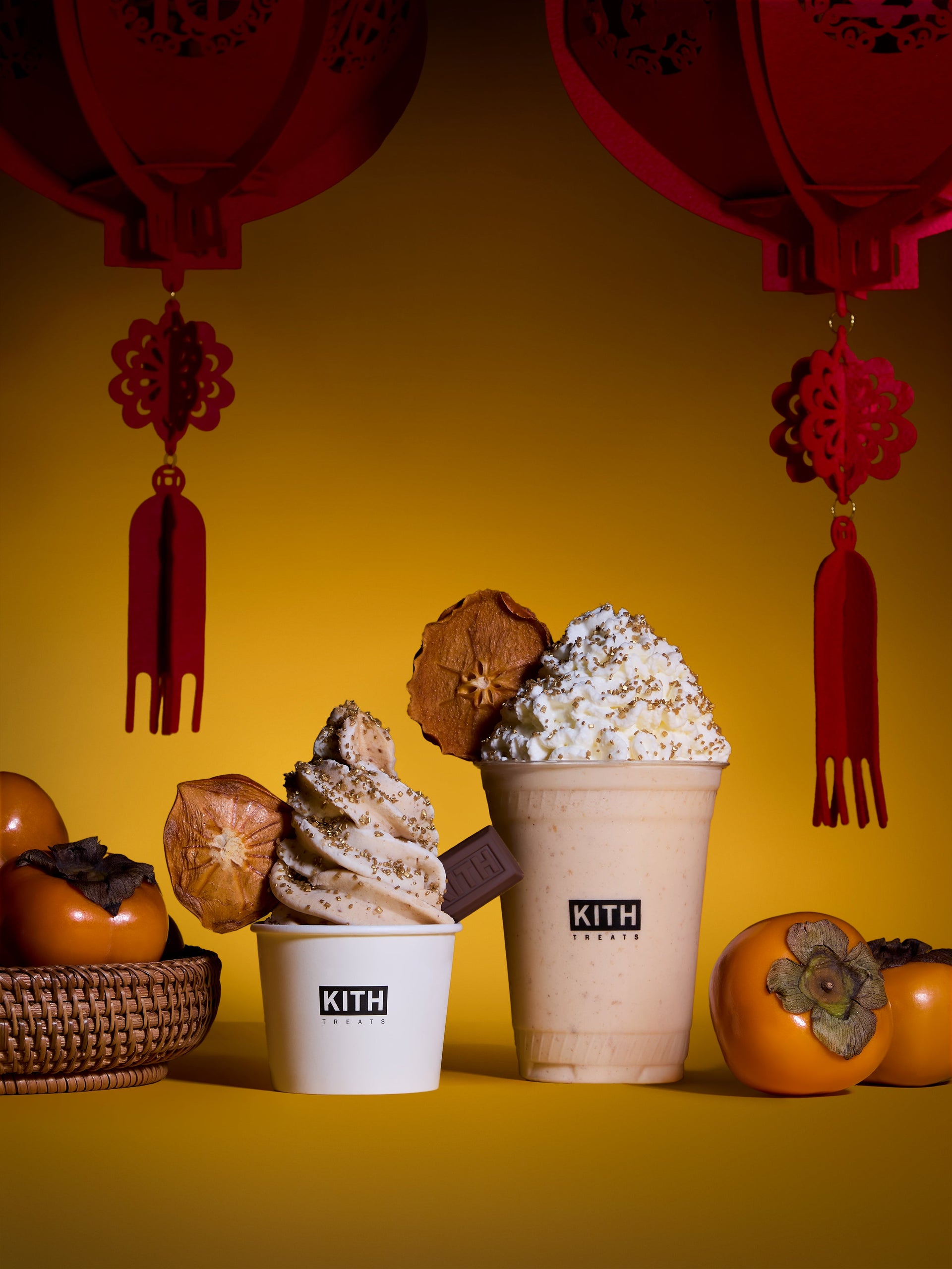 Treats Lunar New Year カプセルコレクションのリリースにあわせ、Kith Treatsでは、柿のとろけるようなやさしい甘さをフィーチャーした期間限定のスペシャルアイスクリームが登場。Swirl、Milkshake、Sandwichのバリエーションで展開されます。旧正月の時期に親しまれる柿は、繁栄や幸運を願う意味を持つ、象徴的なフルーツとして知られています。鮮やかなオレンジレッドの色合いは「運・幸福・繁栄」を象徴し、丸く欠けのない形は「豊かさ」を表しています。冬の季節を通して生や干し柿として楽しまれることから、「甘く実りある一年」への願いに加え、継続性や長寿への想いも込められています。