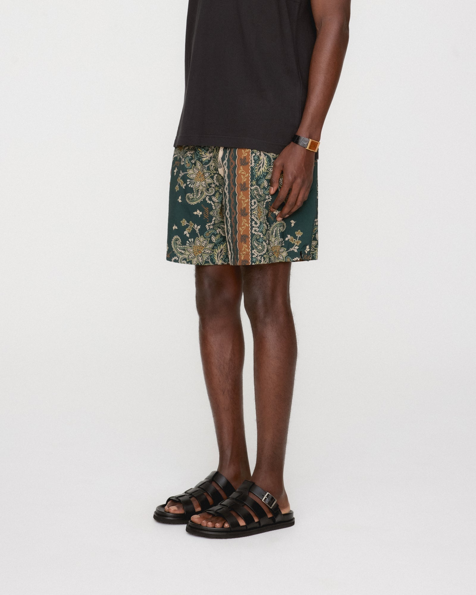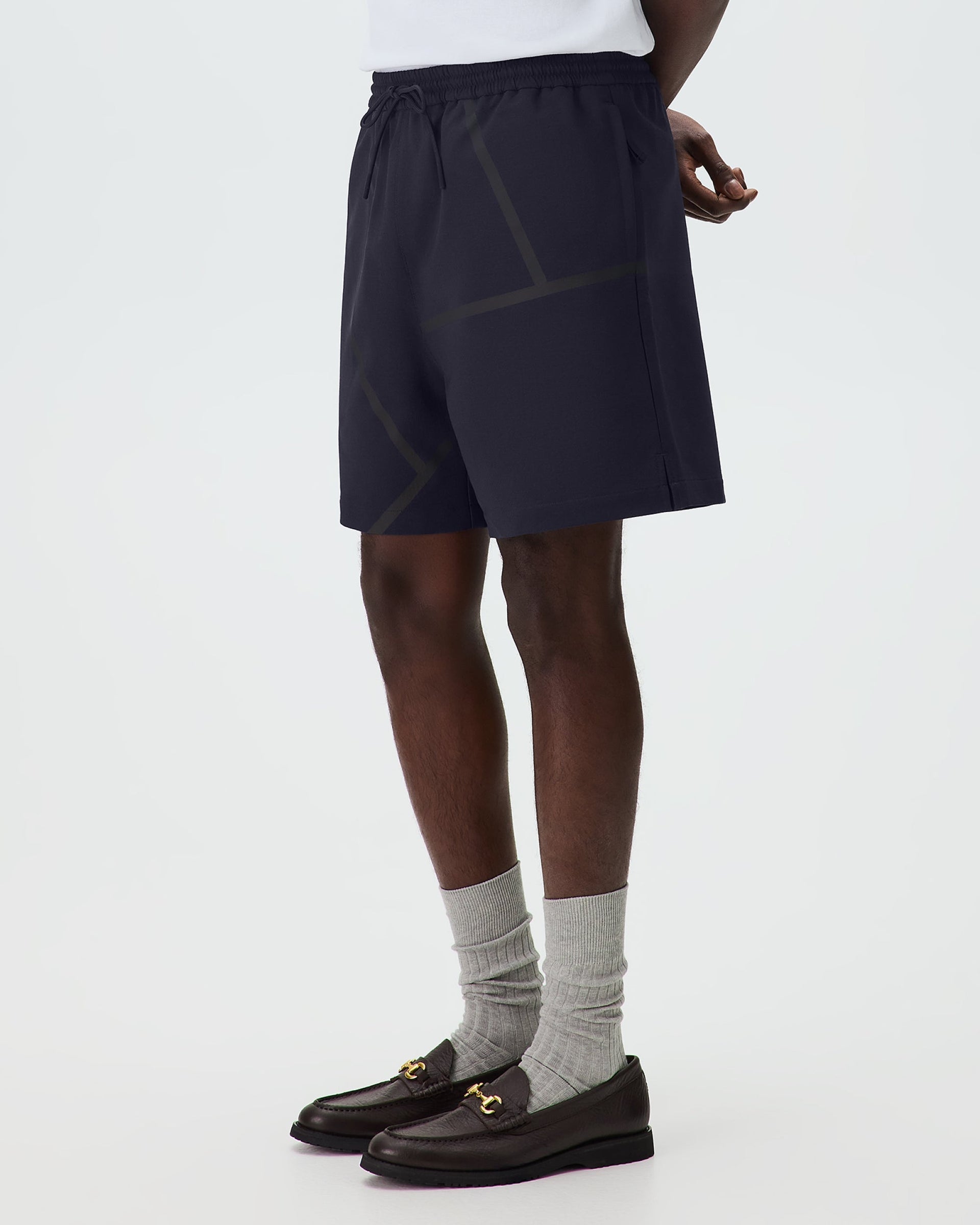 Explore Kith Innovative Wovens showcasing distinctive fabrications and unique patterns. This collection is highlighted by textured materials like seersucker, lace, and bubble check patterns and finished with custom details like side slits at the hem, drawcord-adjustable waistbands, and zippered back pockets. From geometric diamond designs to panelled bandana styles, each piece reimagines classic short silhouettes through the Kith lens.